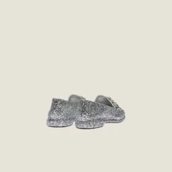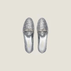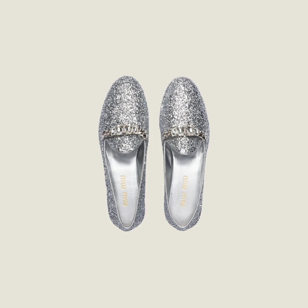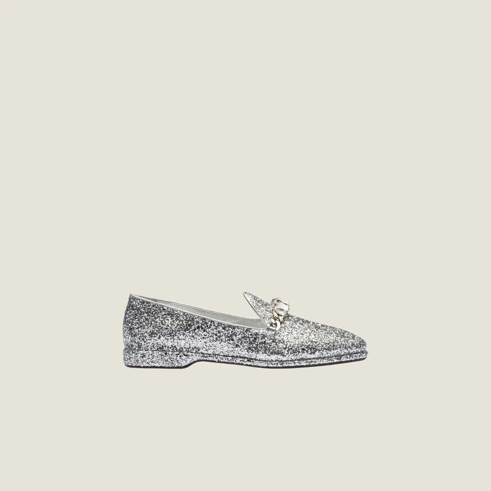 A shower of glitter covers these loafers, offering the irreverent version of a classic style. The metal chain ornament, embellished with artificial crystals, adds an additional sparkling and precious touch to the shoe. The hot-stamped logo completes the design with an iconic note.