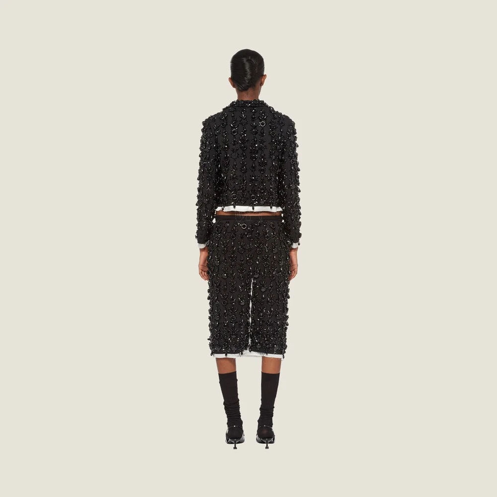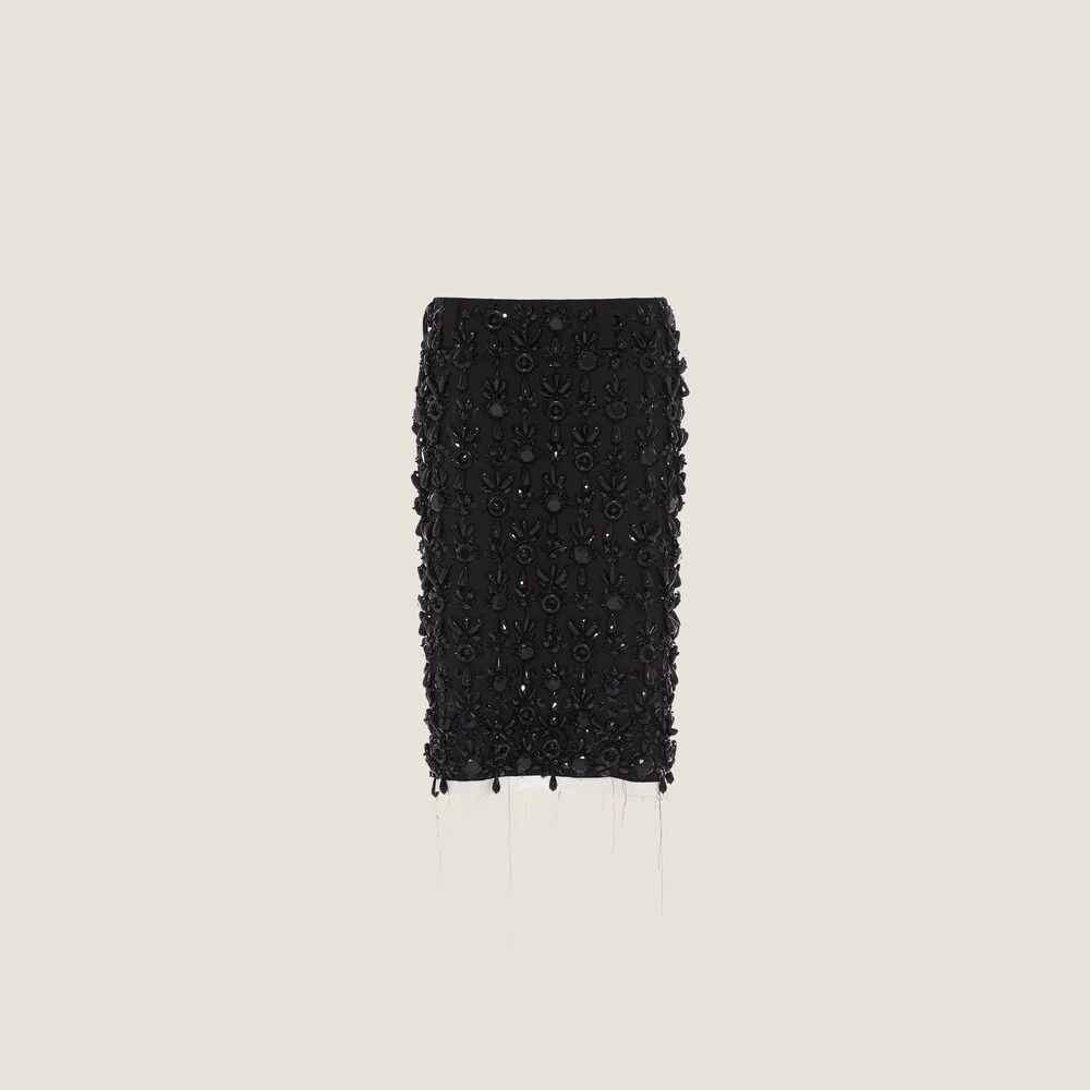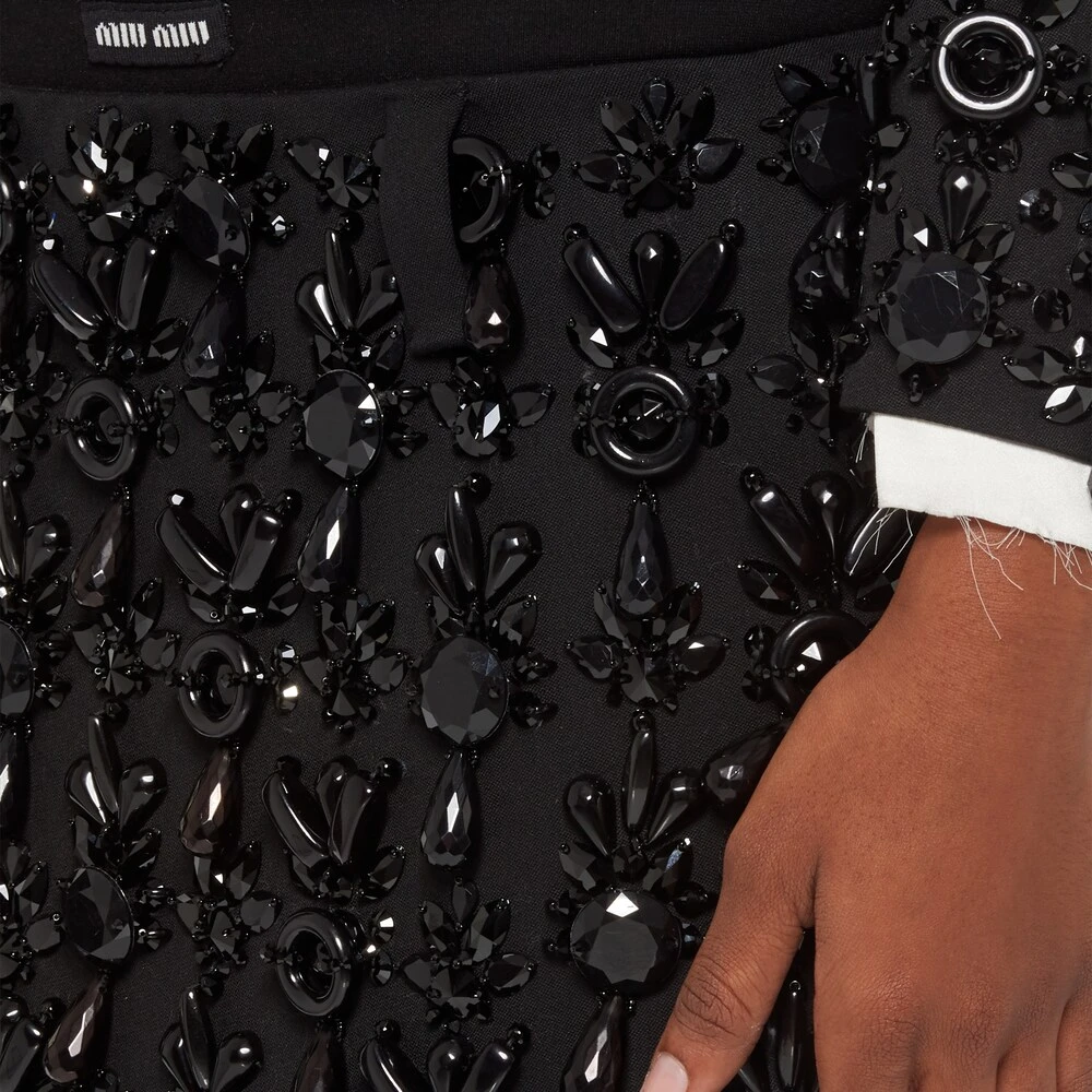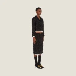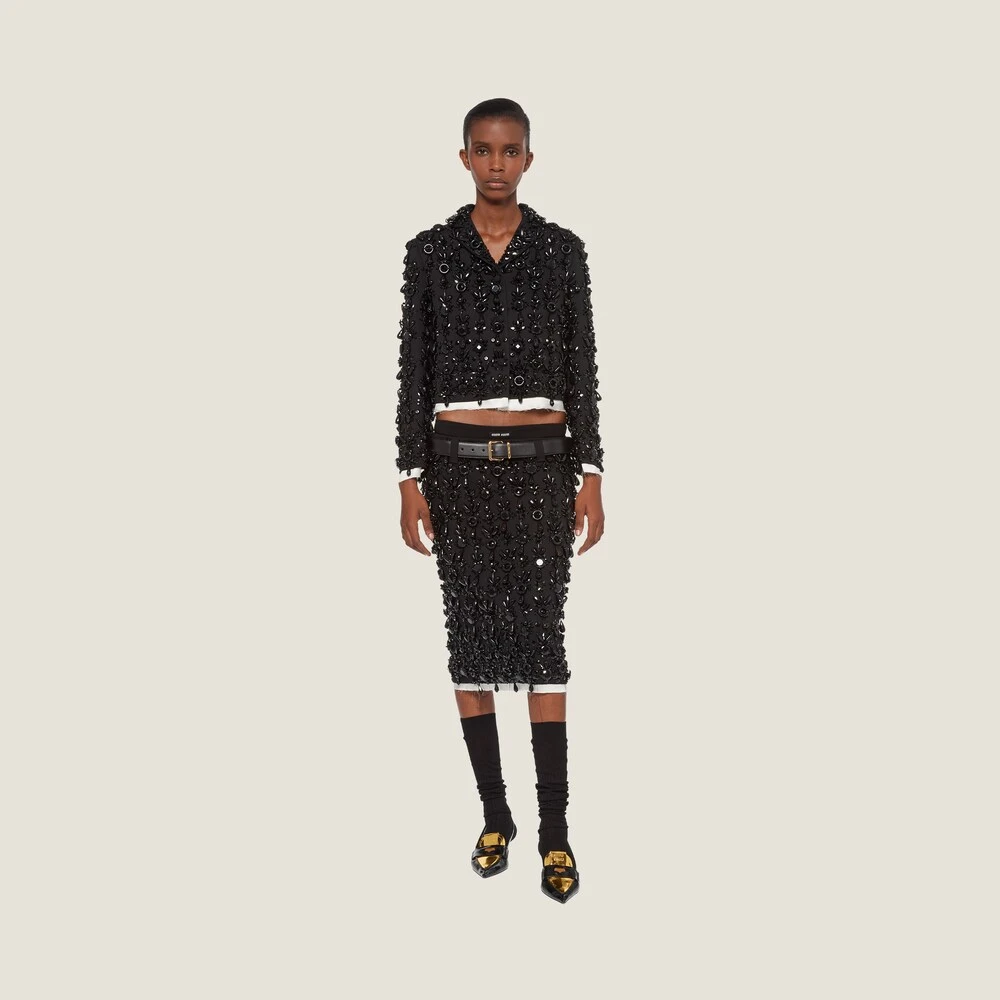 The Miu Miu Spring Summer 2022 collection is an exercise in references and a study of reality, using what exists to create new irreverent silhouettes through novel proportions and precious details. Classic tailoring is subverted and classic women’s garments take on new meanings. An ironic, ultra-feminine design and embroidery echoing eveningwear embellishments characterize this skirt with raw-cut hem.