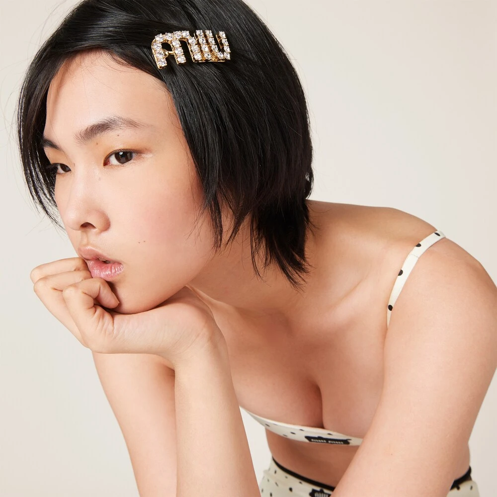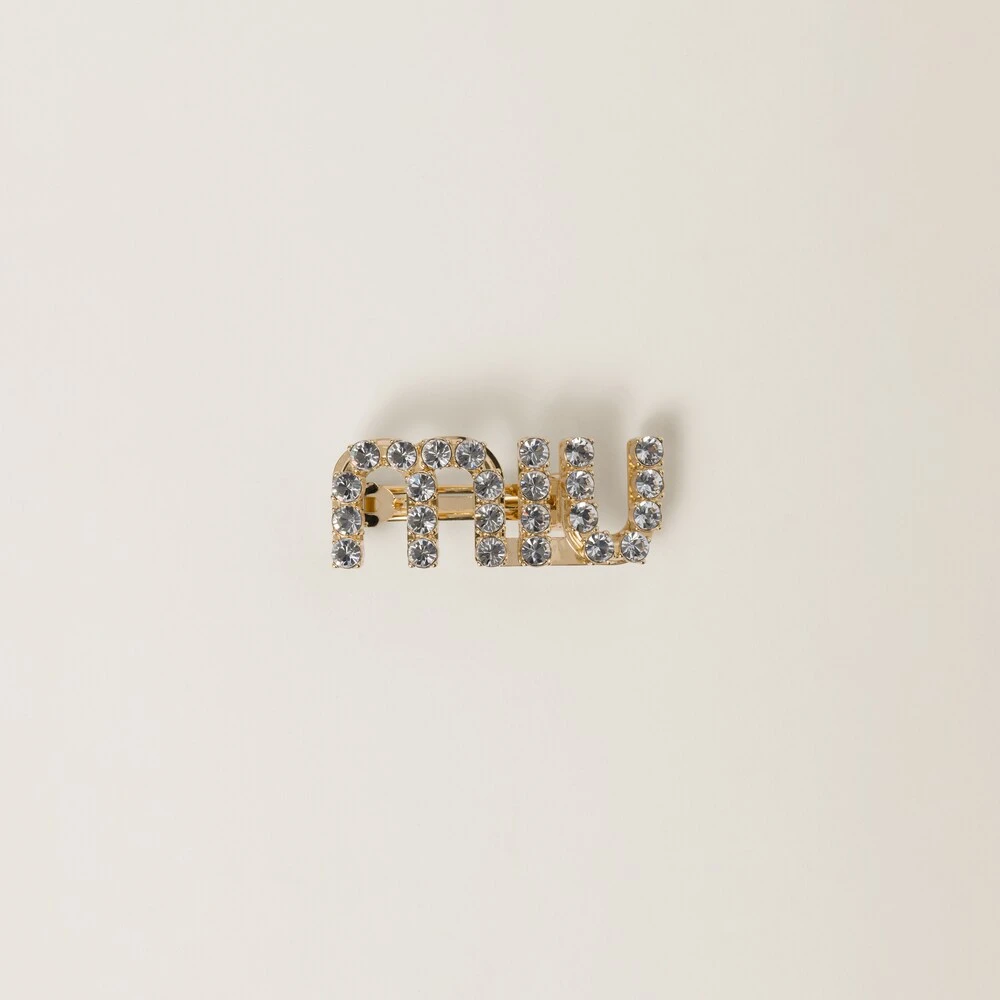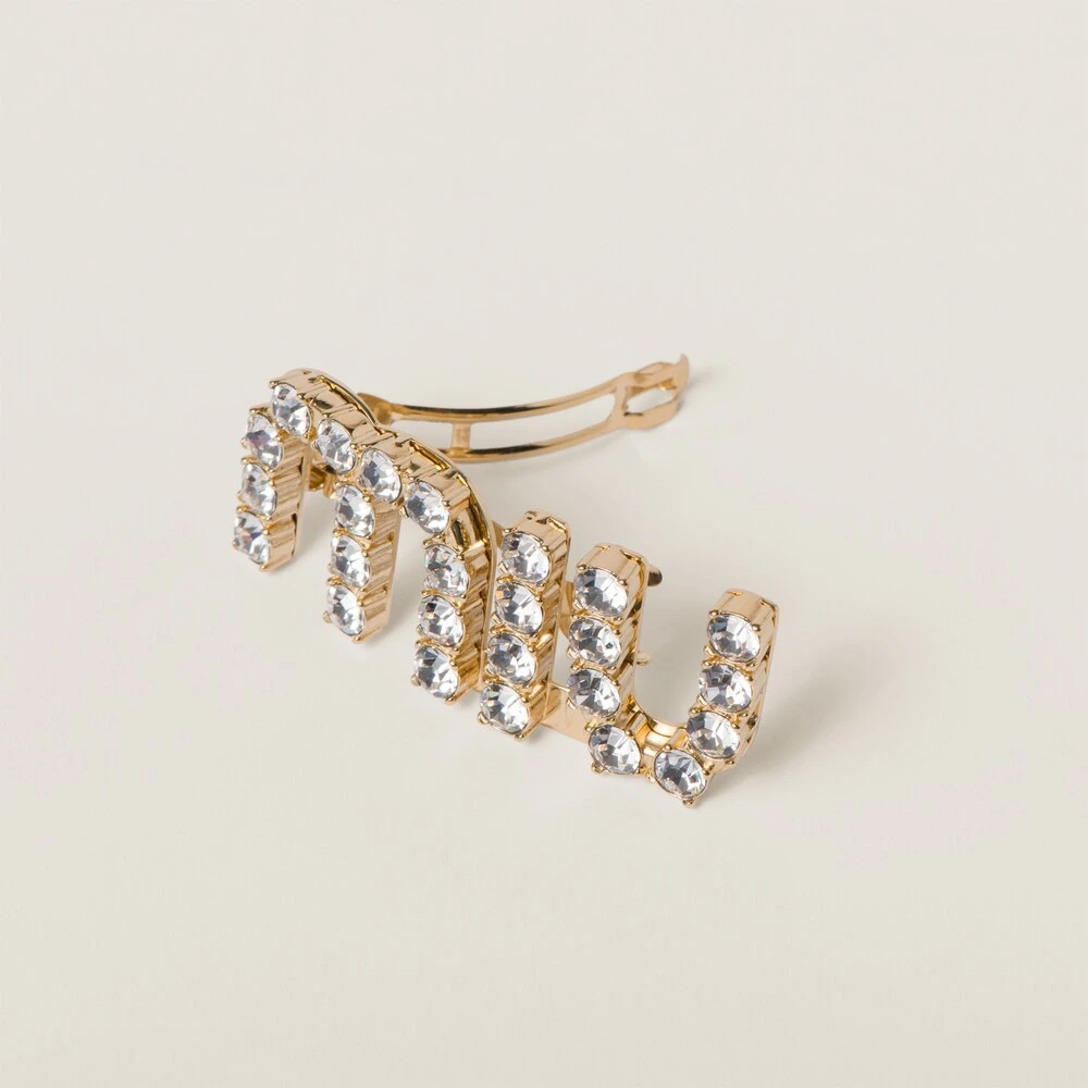 This dazzling crystal hair clip with a sophisticated palladium finish has a metal clip on the back. The iconic logo is featured.