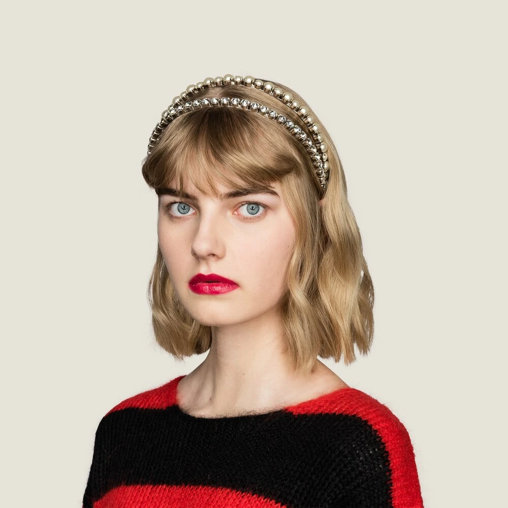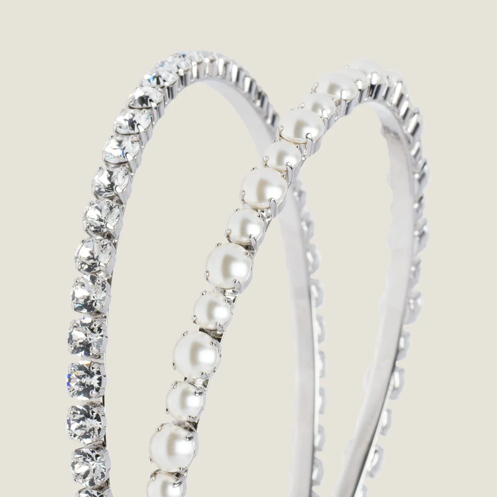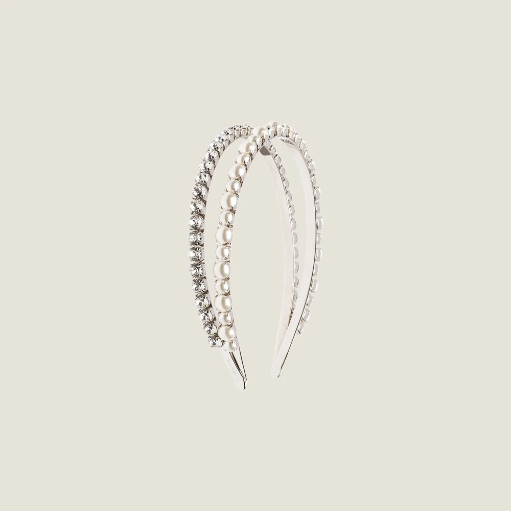The double metal headband hand-decorated with pearls and crystals has contemporary, feminine appeal. The brass details with shiny palladium finish are distinctive.