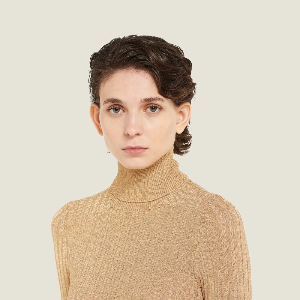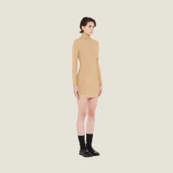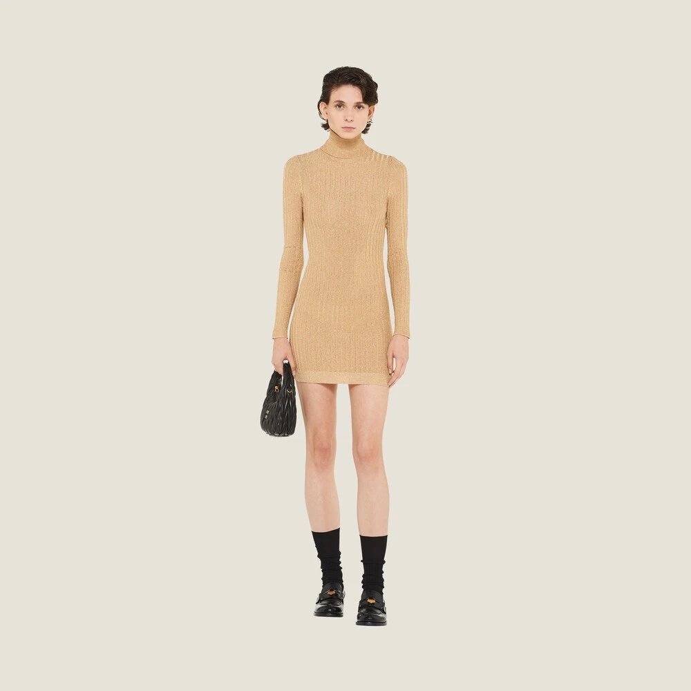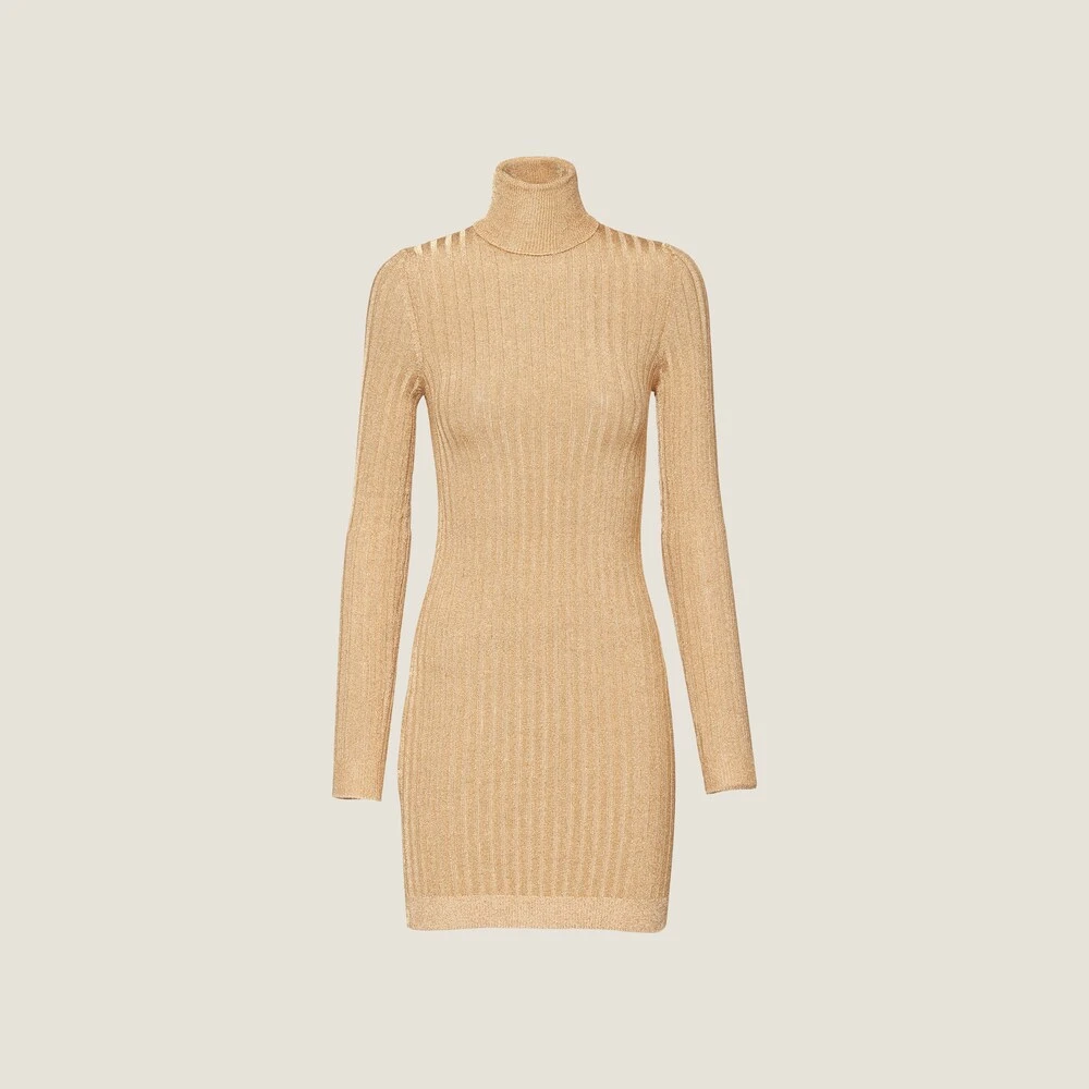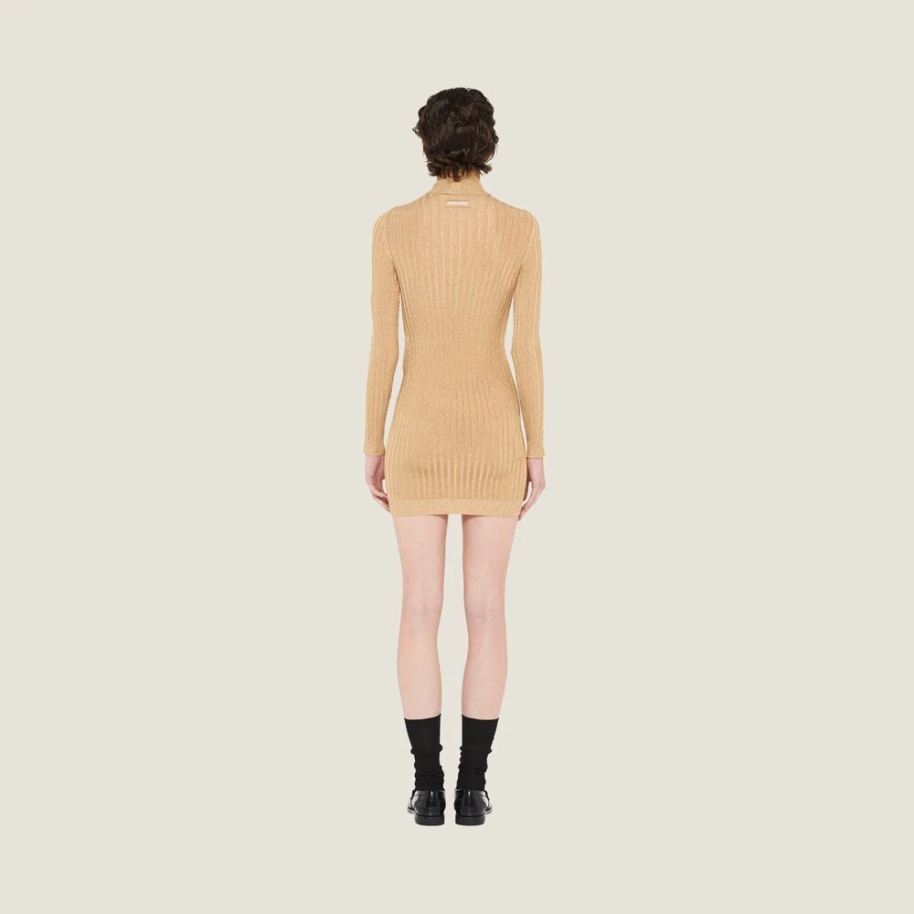A slim fit, emphasizing the feminine silhouette, is featured on this mini dress with a bold, elegant style. Made with lamé, the brightness of the material creates a play of reflections and makes this piece stand out.