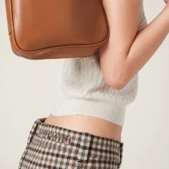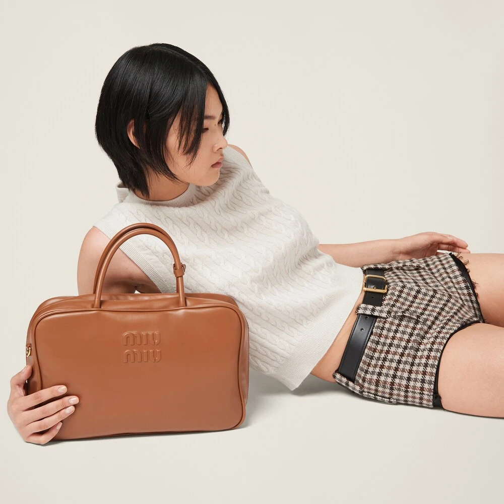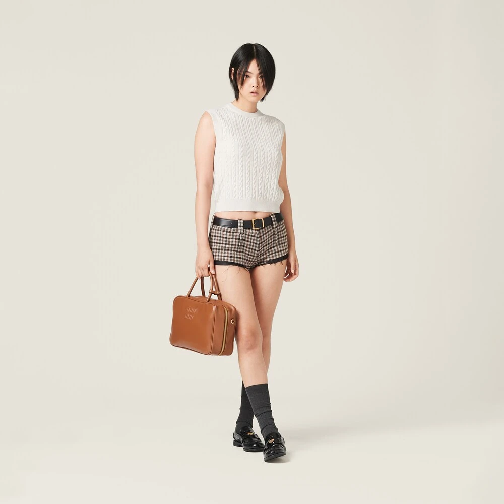 The classic character of the houndstooth check pattern is combined with Miu Miu’s bold attitude in these shorts. The raw-cut contrasting hem suggests a construction process left exposed to underline the spontaneity of these actions. The embroidered logo on the back completes the look with an iconic note.