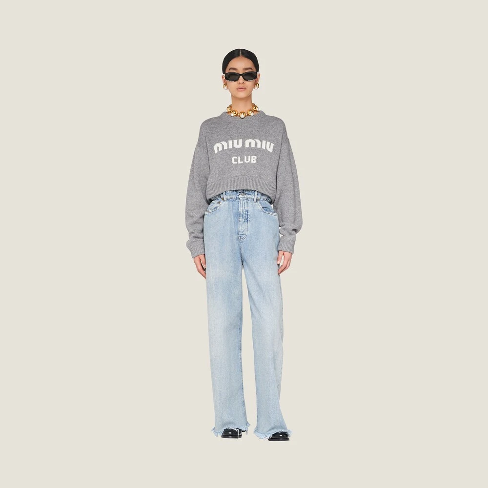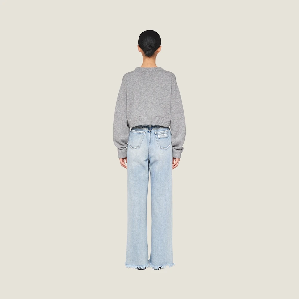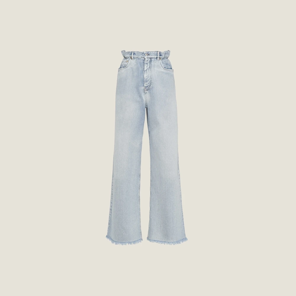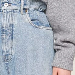 These loose fit iconic denim jeans have contemporary charm. The original elastic at the waist accentuates the shape.