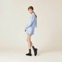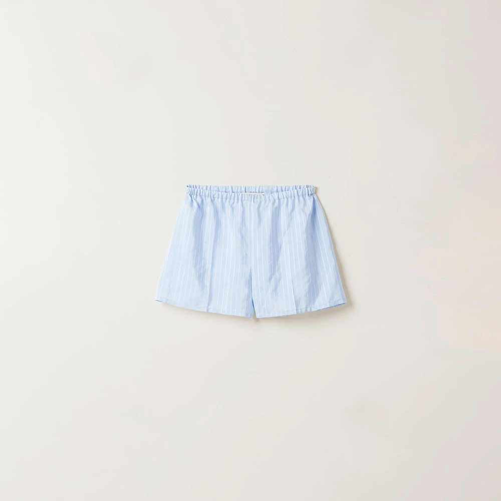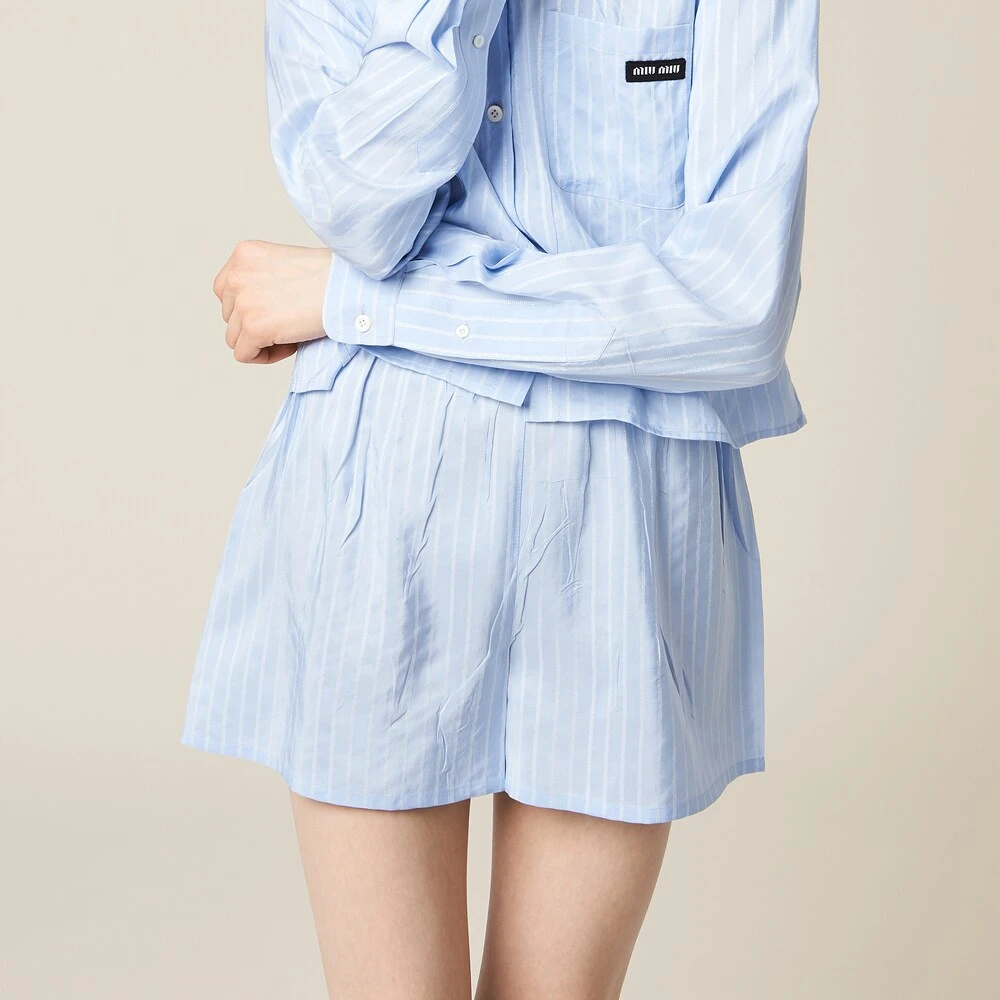These jacquard pongé boxer shorts reinterpret a menswear garment by drawing from Miu Miu’s provocative femininity. The stripe motif on the fluid texture of the fabric creates a refined, playful design. The knit logo label completes the aesthetic with a captivating contrast and iconic note.