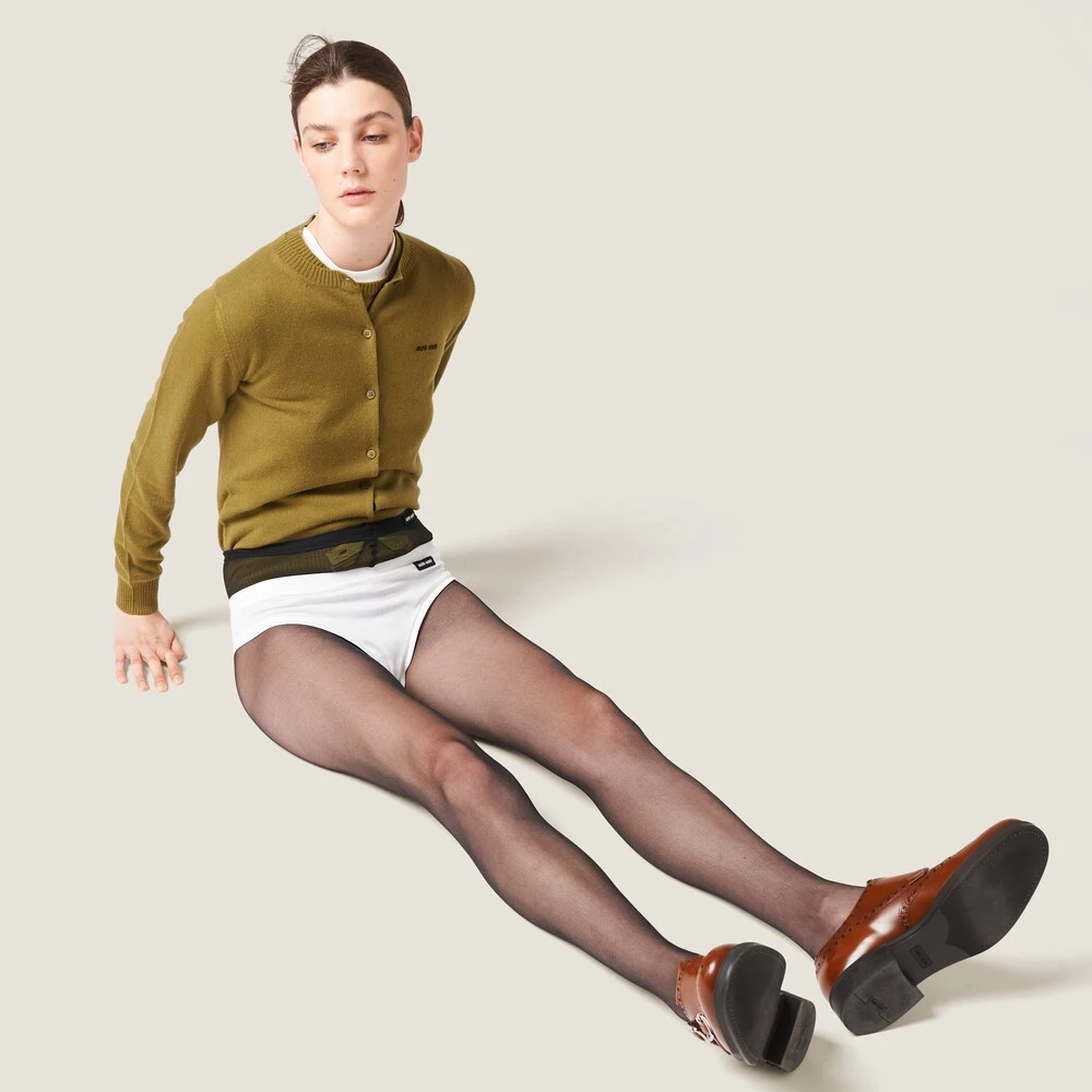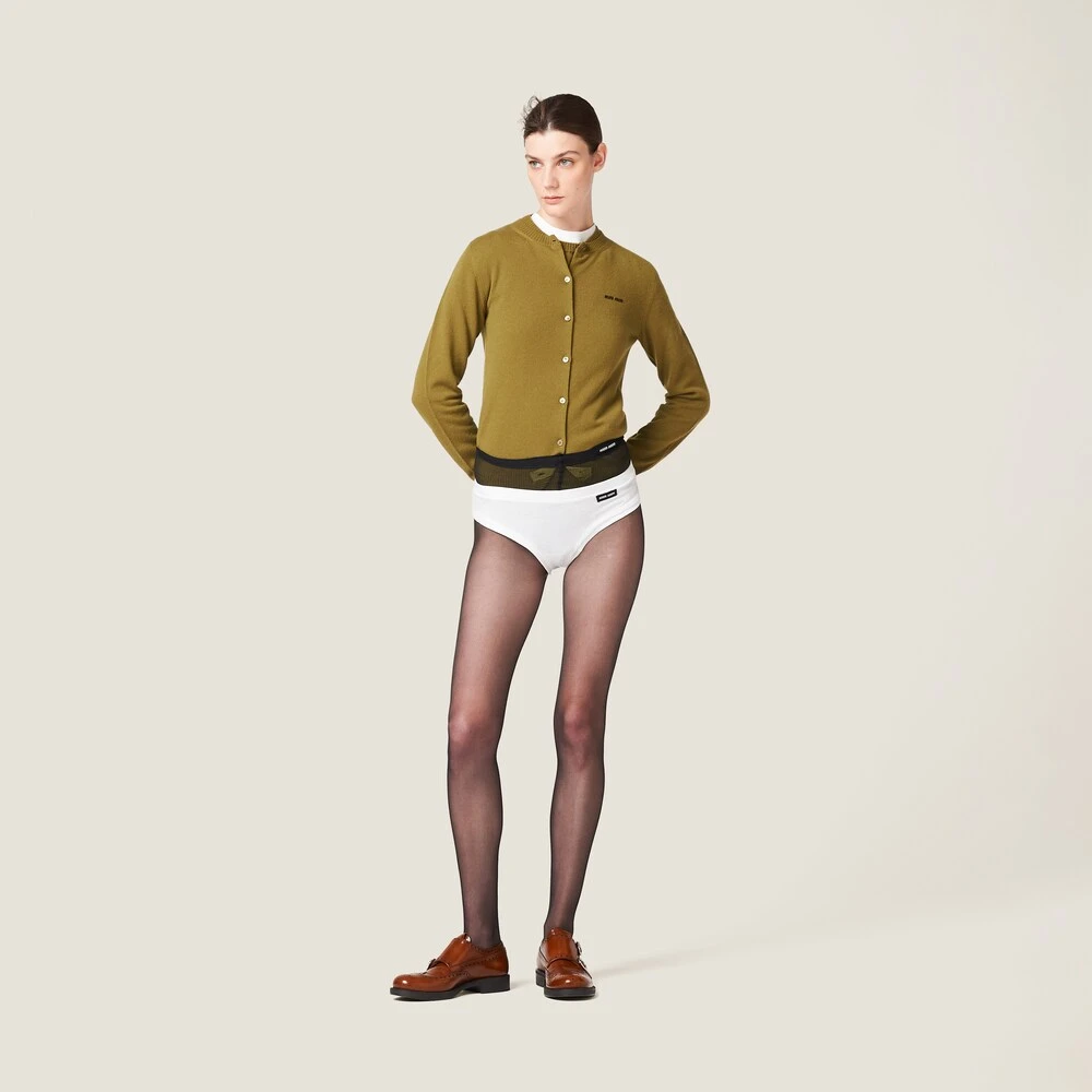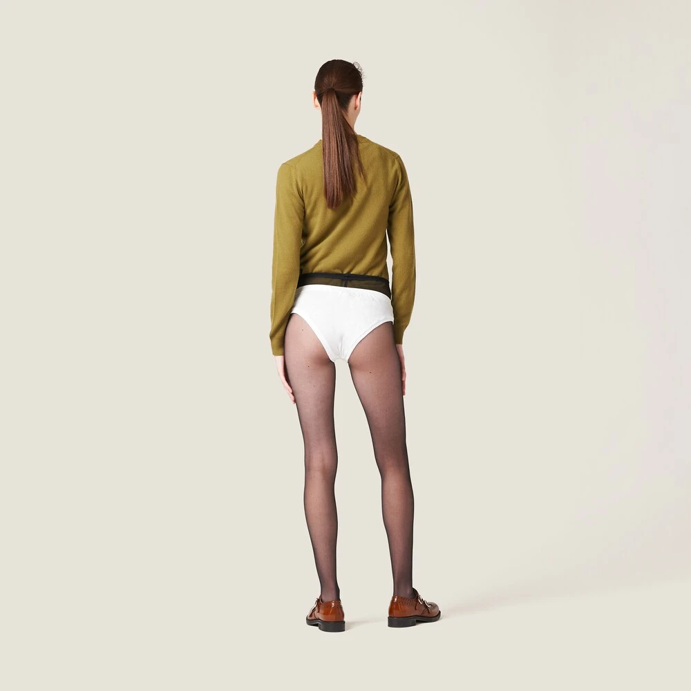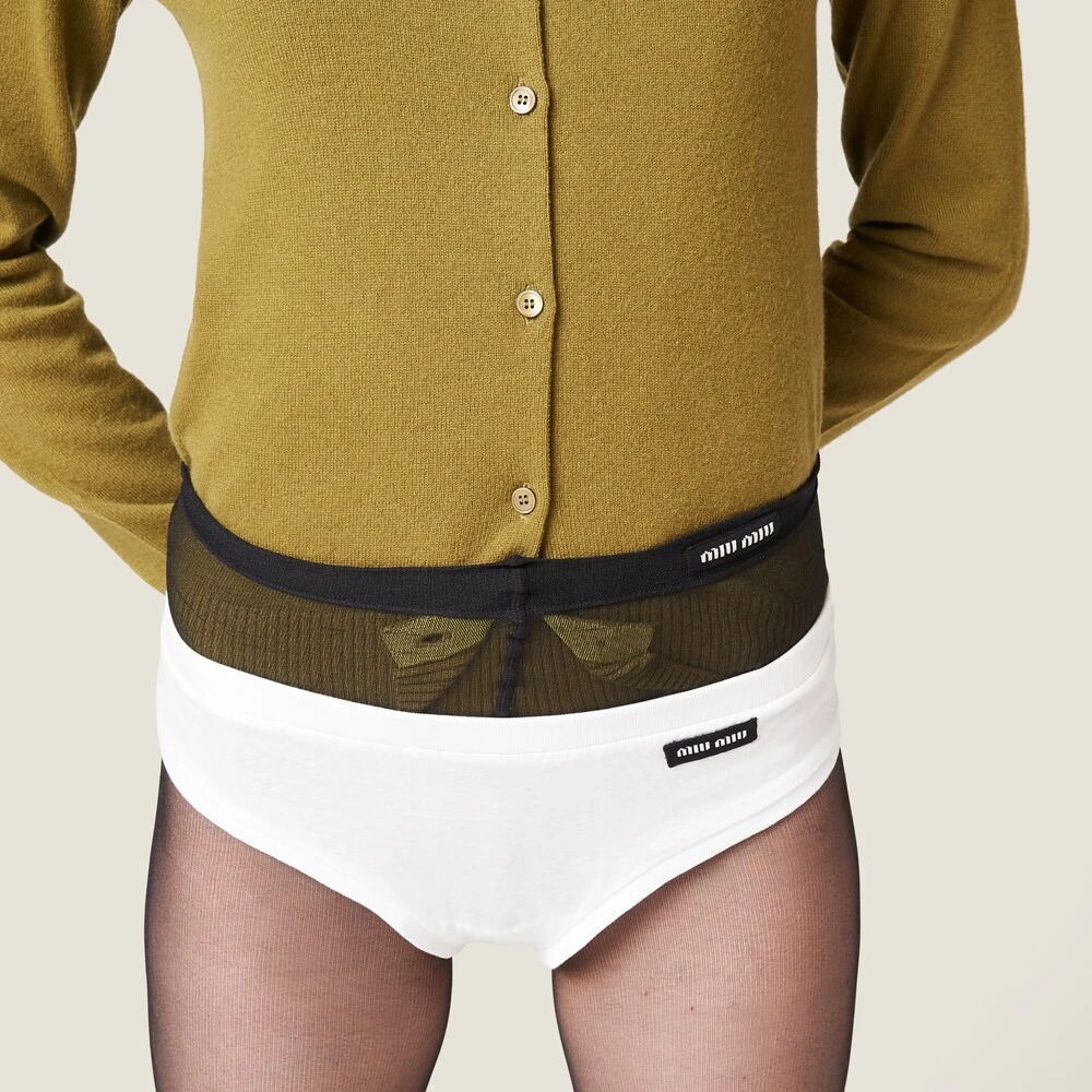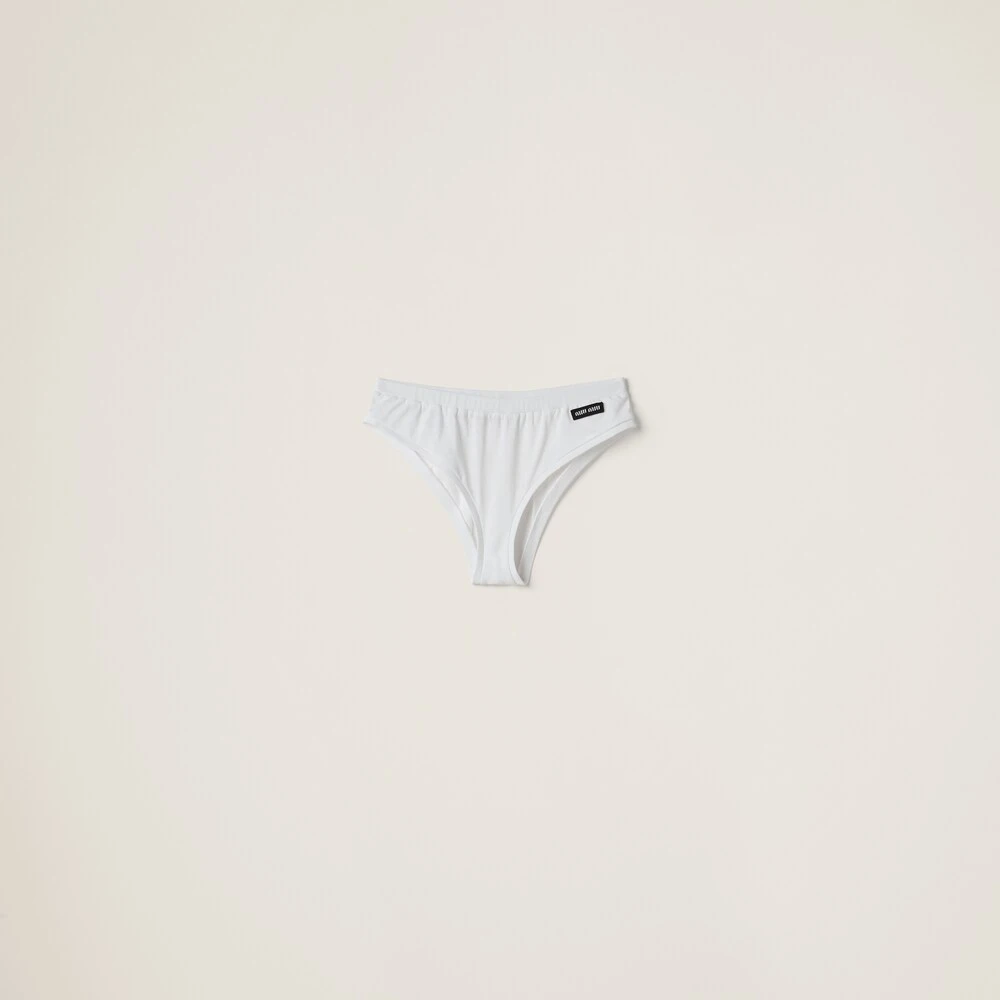 The simple style of these jersey panties is enhanced by the iconic character of the Miu Miu logo that adds a color contrast and completes the garment with a distinctive note.