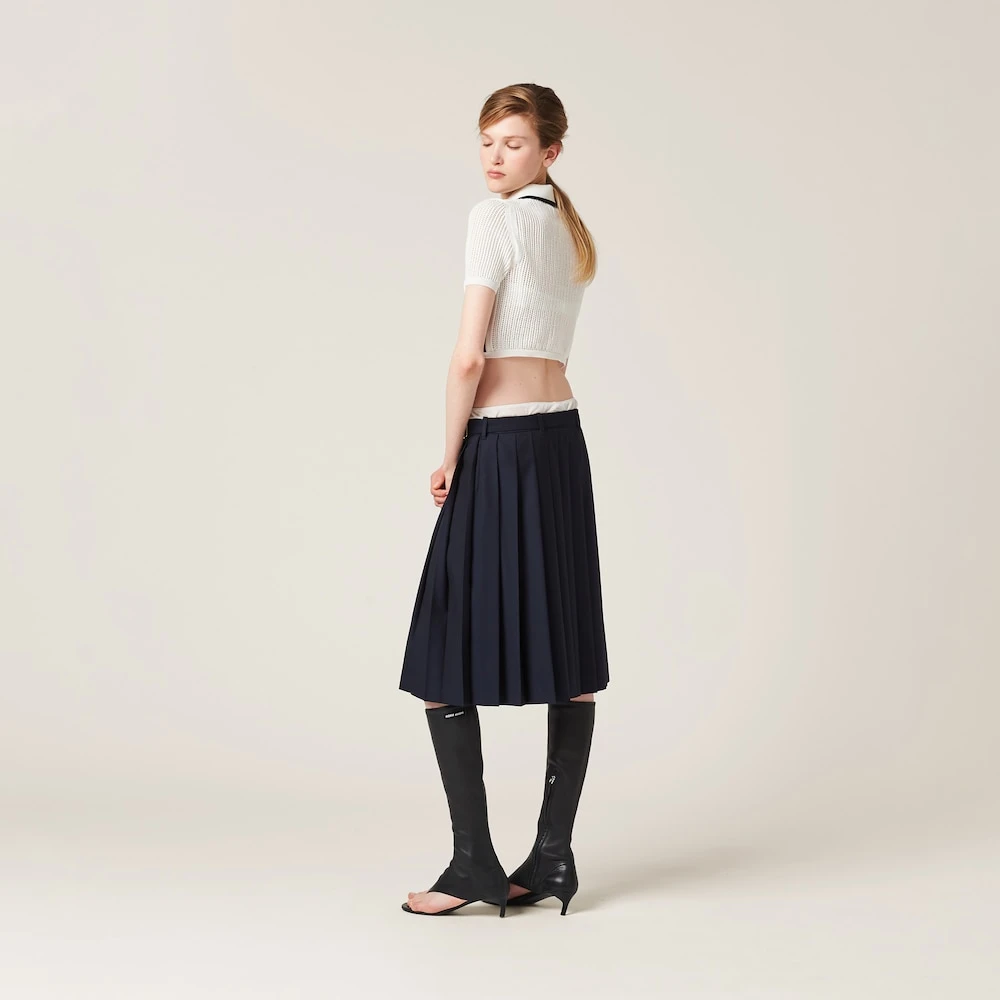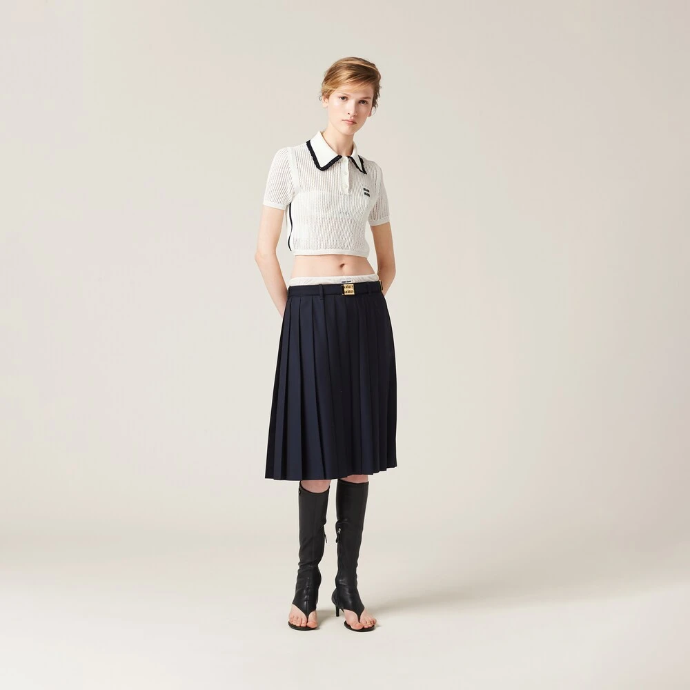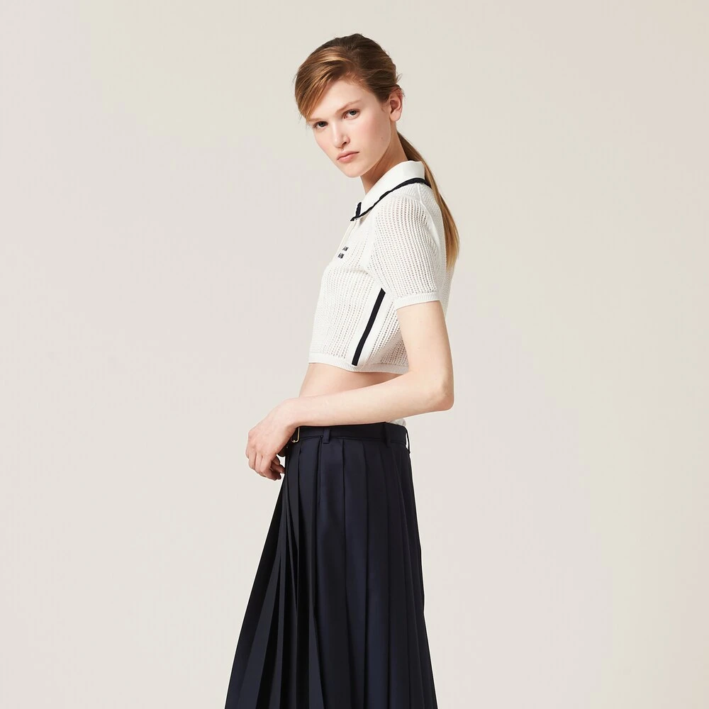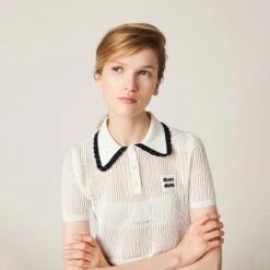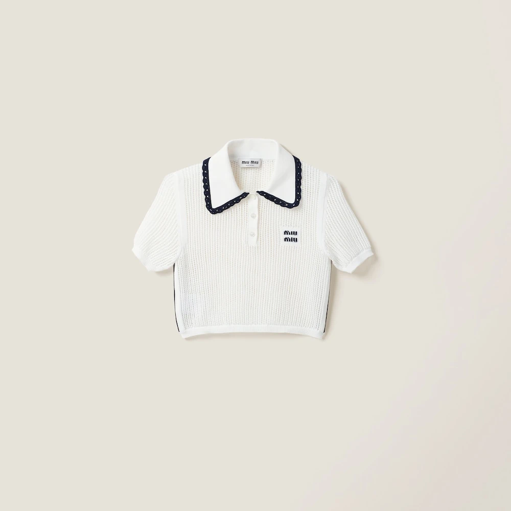 A special perforated knit motif that recalls mesh creates refined transparencies on this polo-style cotton sweater. The design of the garment combines ribbed knit trim and a refined collar with crochet embellishment in the same color as the intarsia logo, which completes the look with an iconic note.