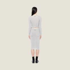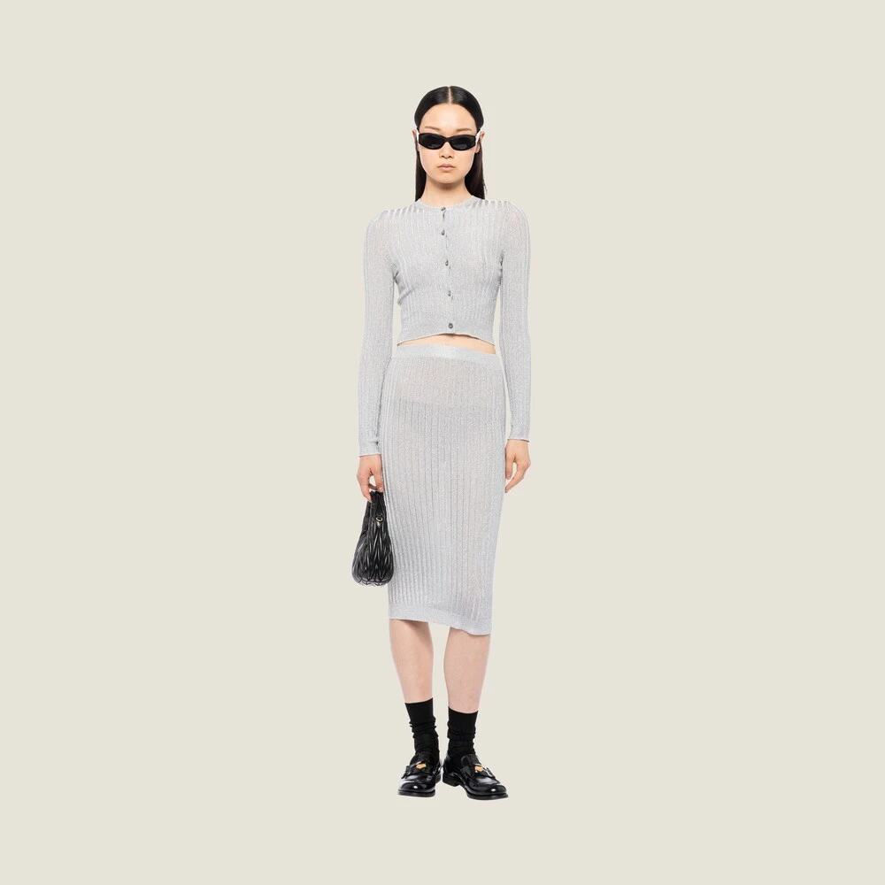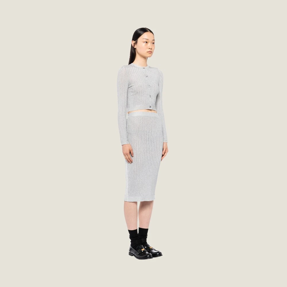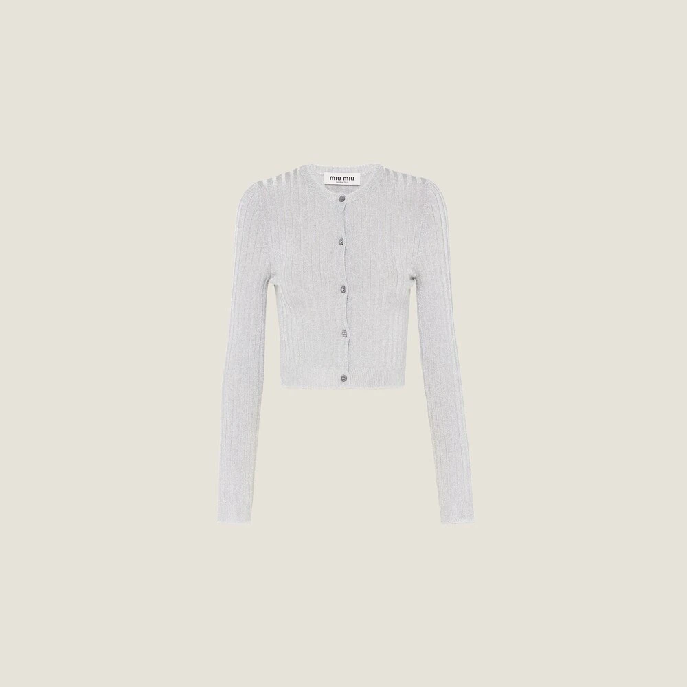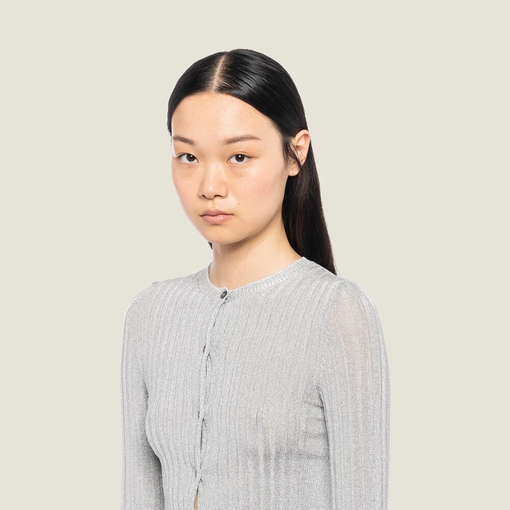 This cardigan with a refined design offers an unusual texture. The bright reflections of the ribbed lamé yarn are reminiscent of elegant evening dresses, suggesting a contemporary take on everyday design styles.