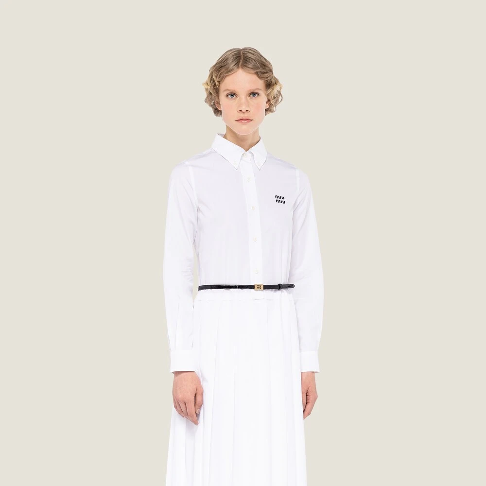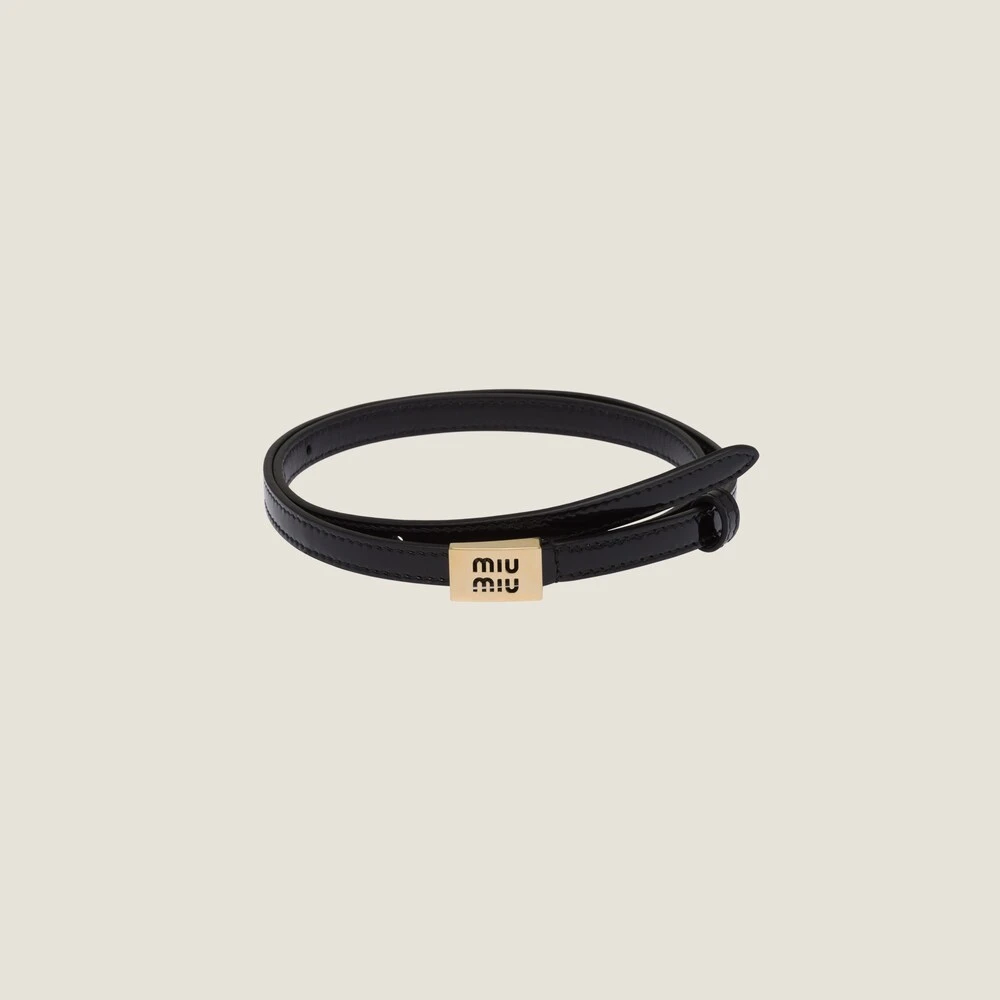 The Miu Miu logo decorates the metal buckle of this narrow leather belt with a playful, modern design.