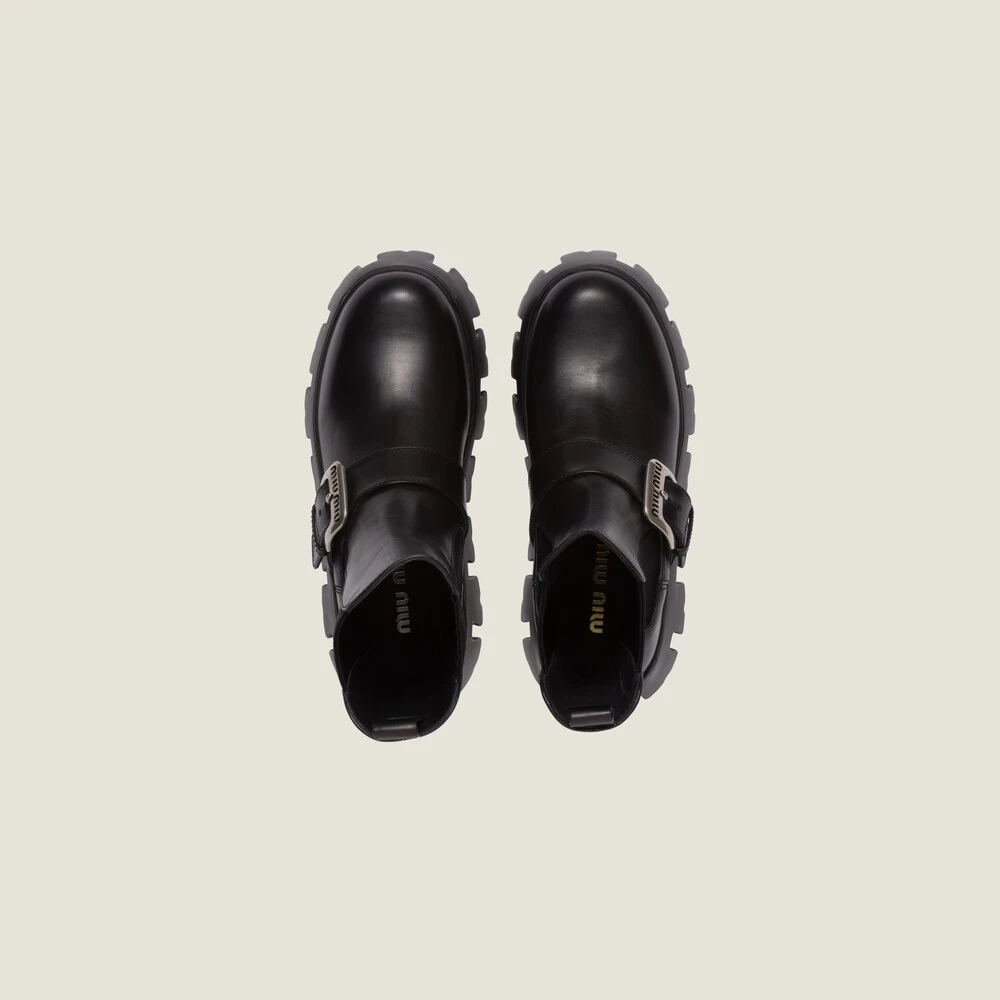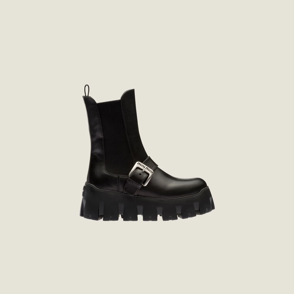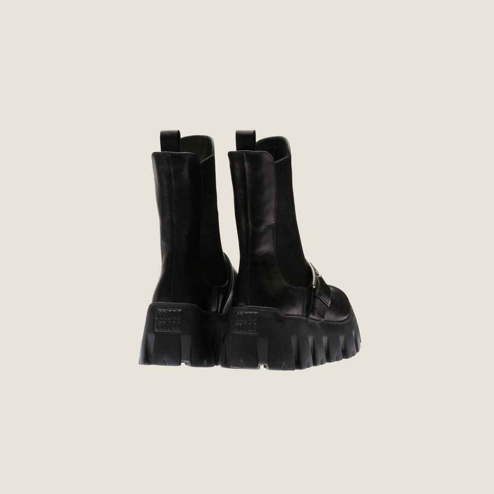 A reinterpretation of the classic Chelsea boot, these leather booties are decorated with the logo-engraved buckle. Traditionally masculine lines are redesigned to created ultra-feminine silhouettes.