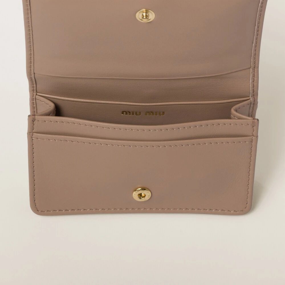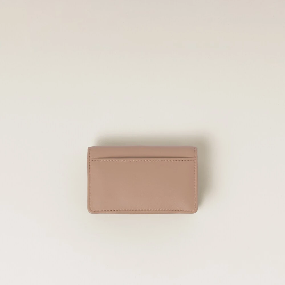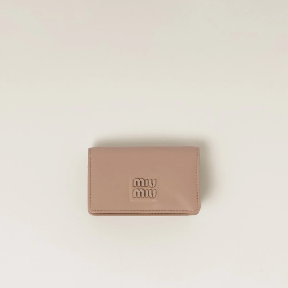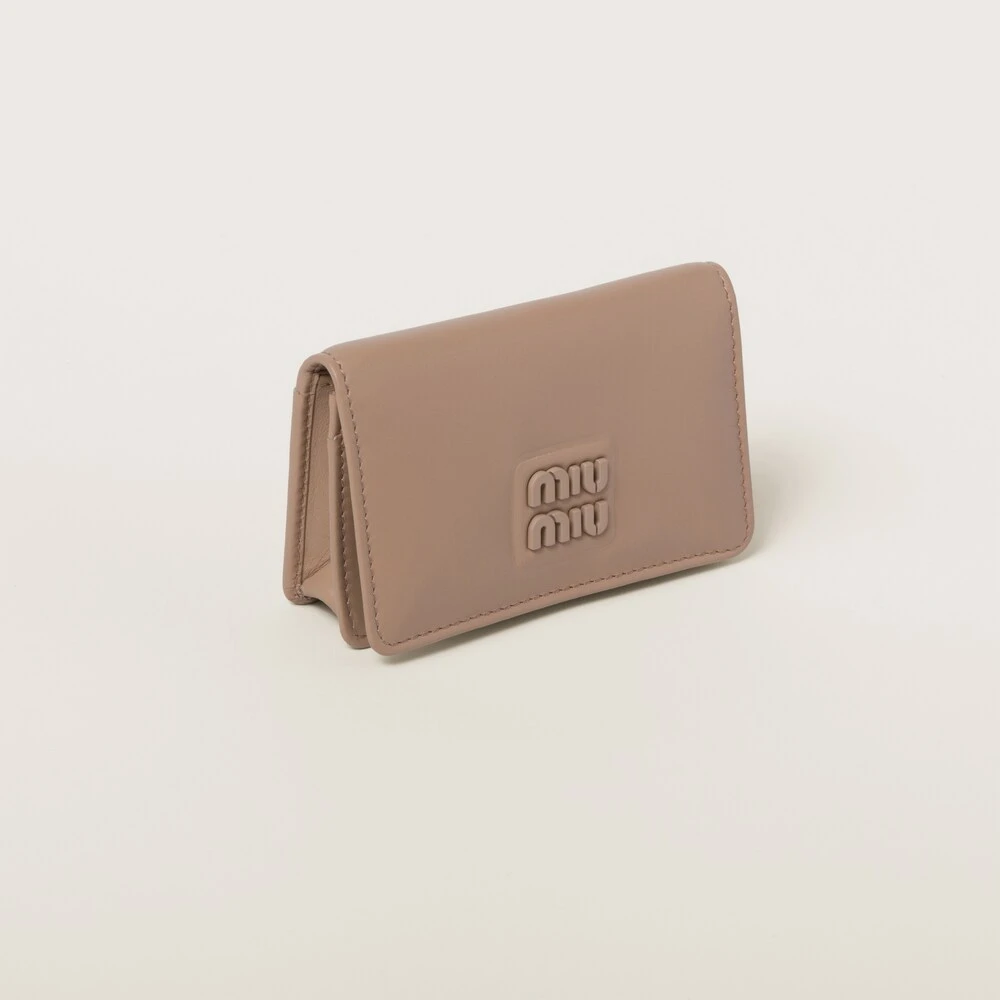 Fine leather and the iconic touch of the Miu Miu logo enhance the sleek lines of this new leather card holder. The card slots and badge holder complete the design with functional details.