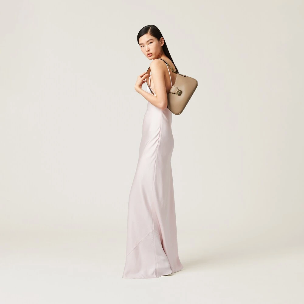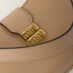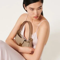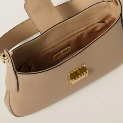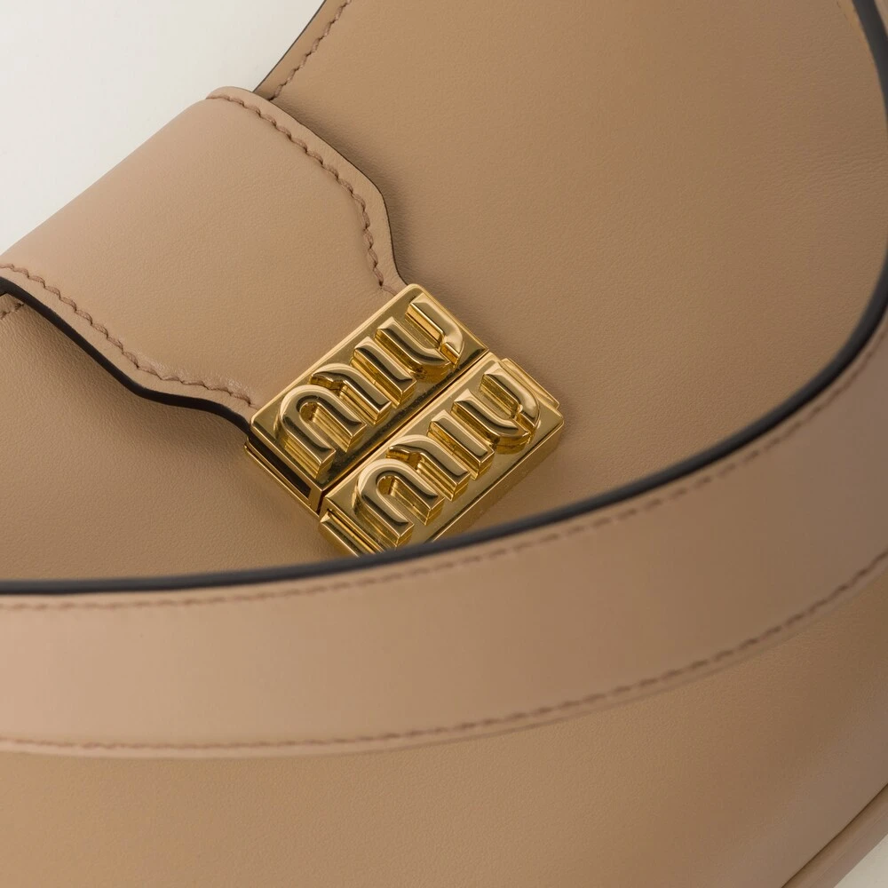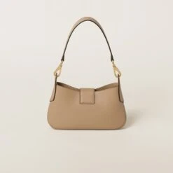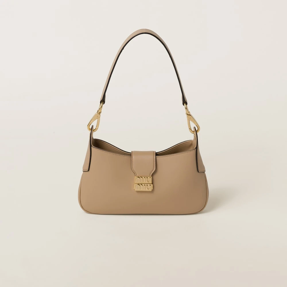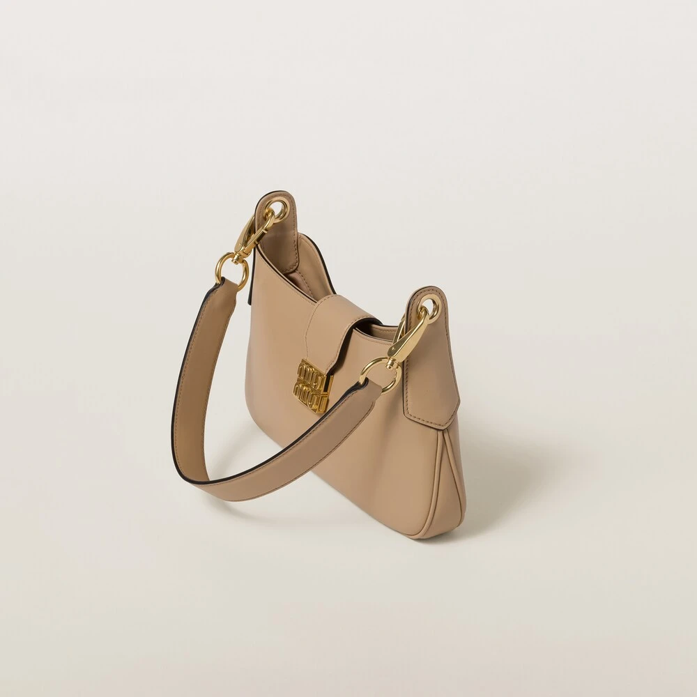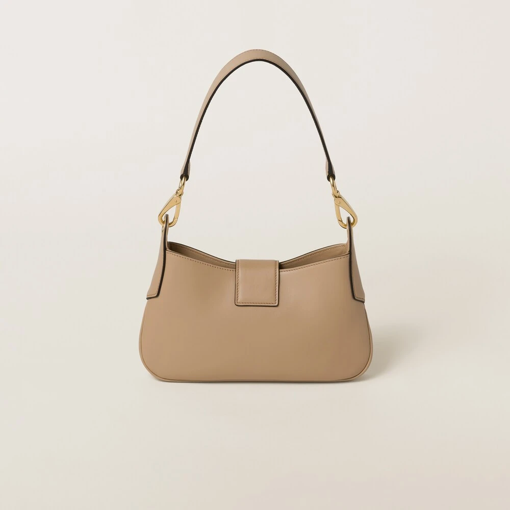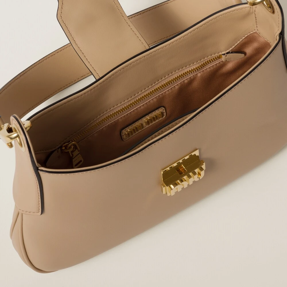 The sleek lines and simple design of this leather hobo bag are enhanced by Miu Miu’s distinctive, bold attitude. The gold-tone hardware adds shiny touches to the bag, while the lettering logo gives the design an iconic and distinctive character. The removable handle completes the bag with a functional detail that accentuates its versatility.