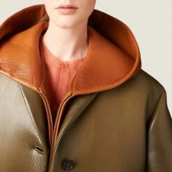 The sleek lines of this jacket highlight the distinctive details, refined attitude, and chromatic intensity of the garment. Bonded leather gives a voluminous look to the jacket, while the logo patch decorates this particular style.