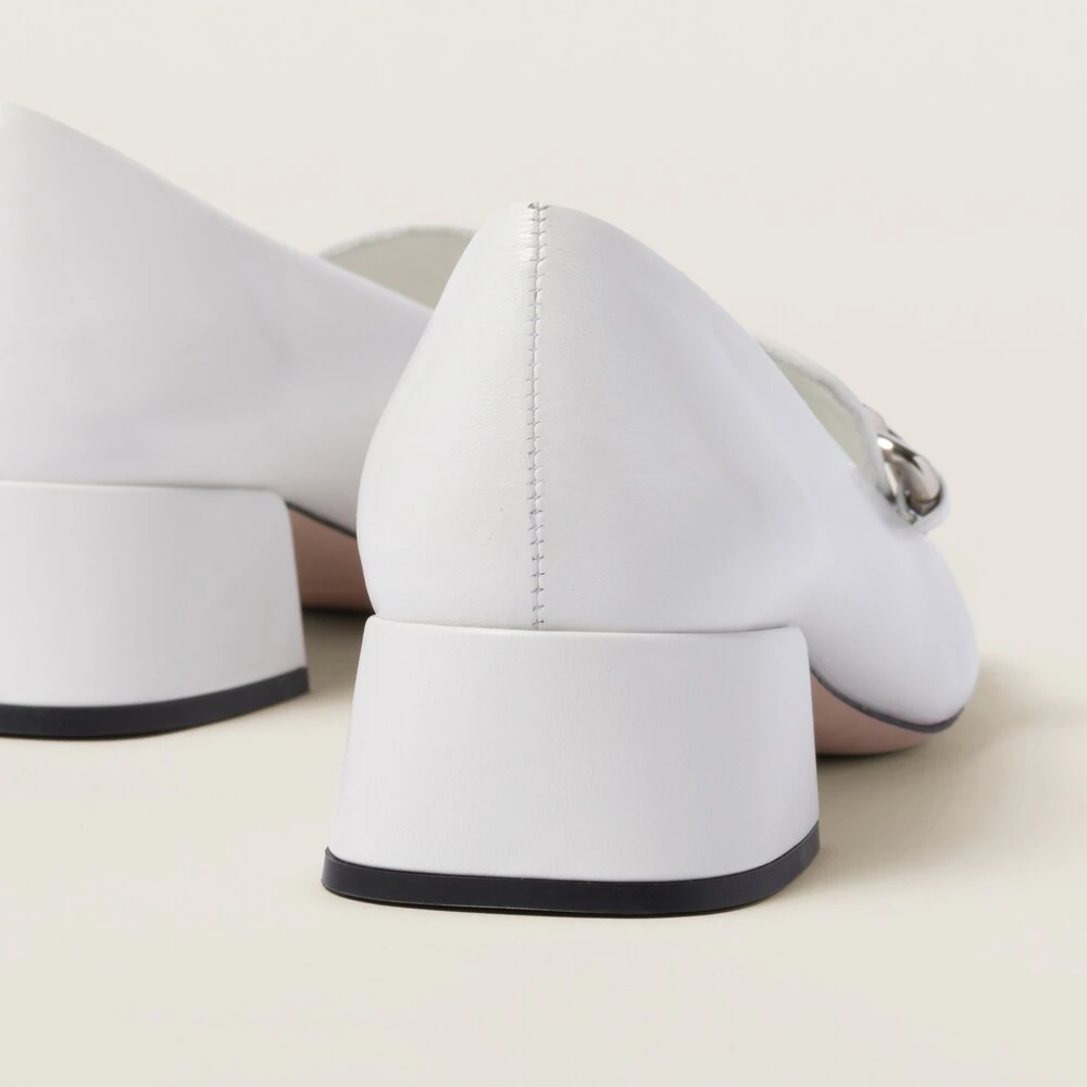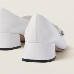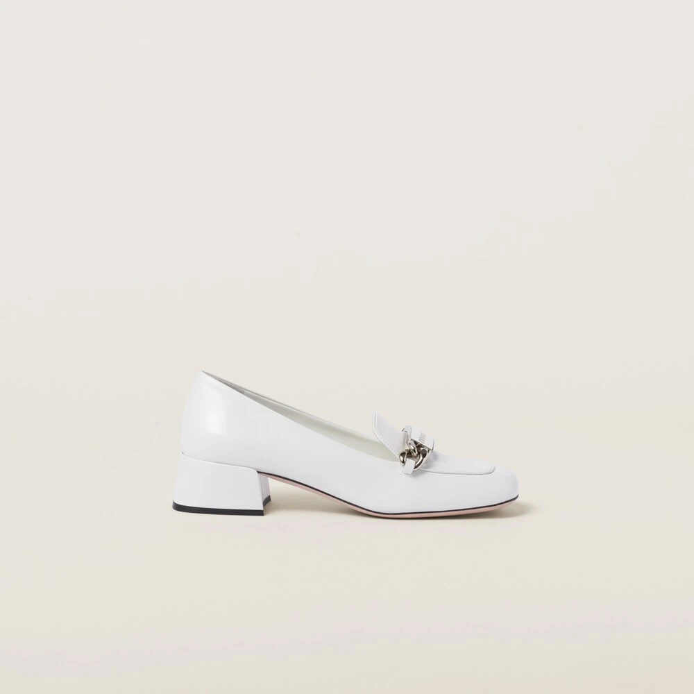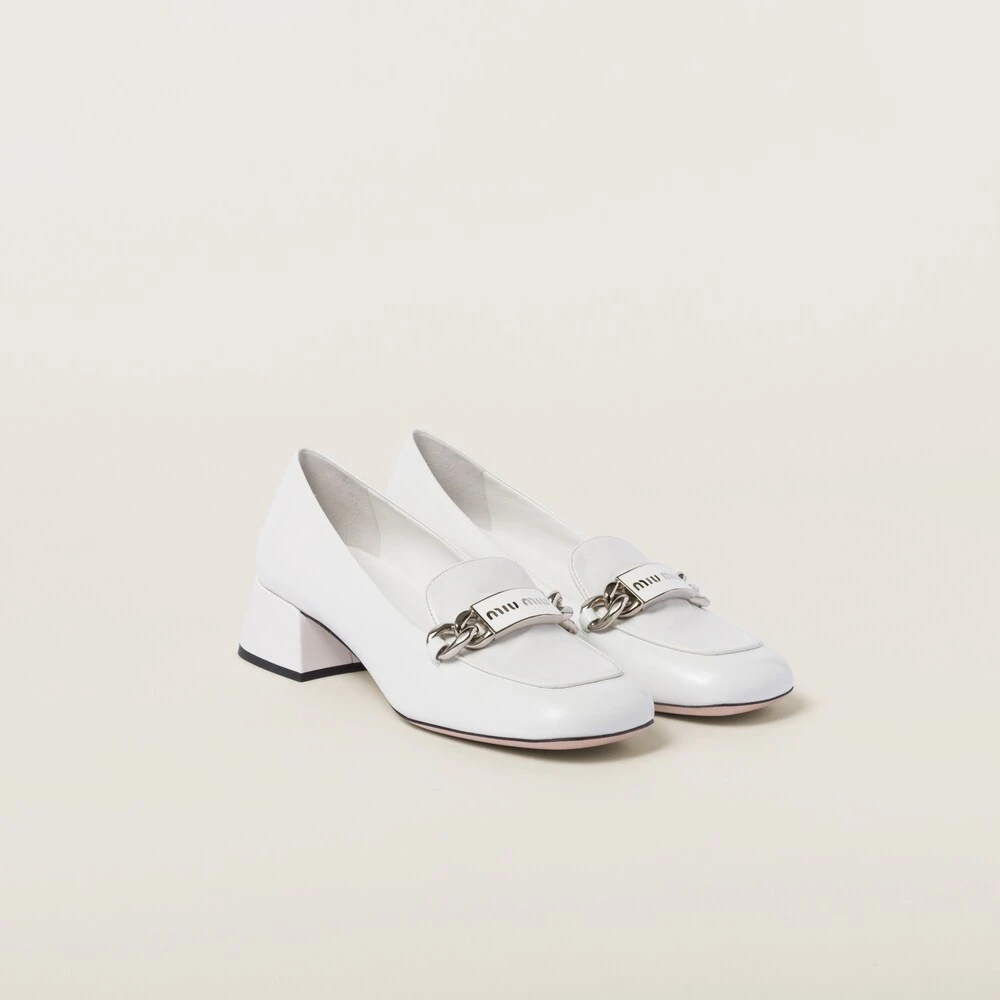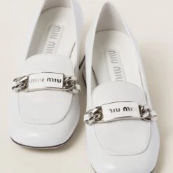 A strong character and feminine silhouette define the bold taste of these leather loafers that reinterpret Miu Miu’s stylistic heritage in an irreverent way. The traditional silhouette is reinterpreted and embellished by the chain and logo that illuminate the shoe, giving it an iconic style.