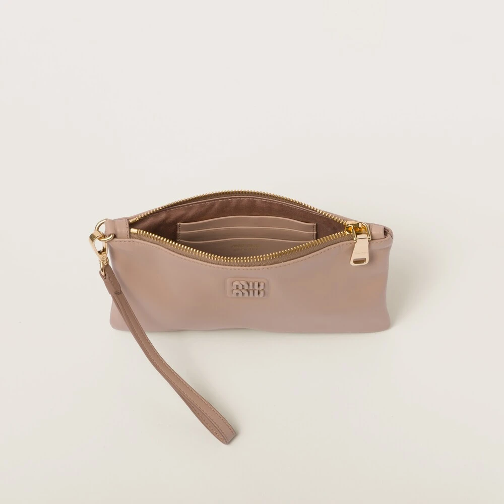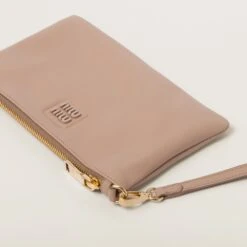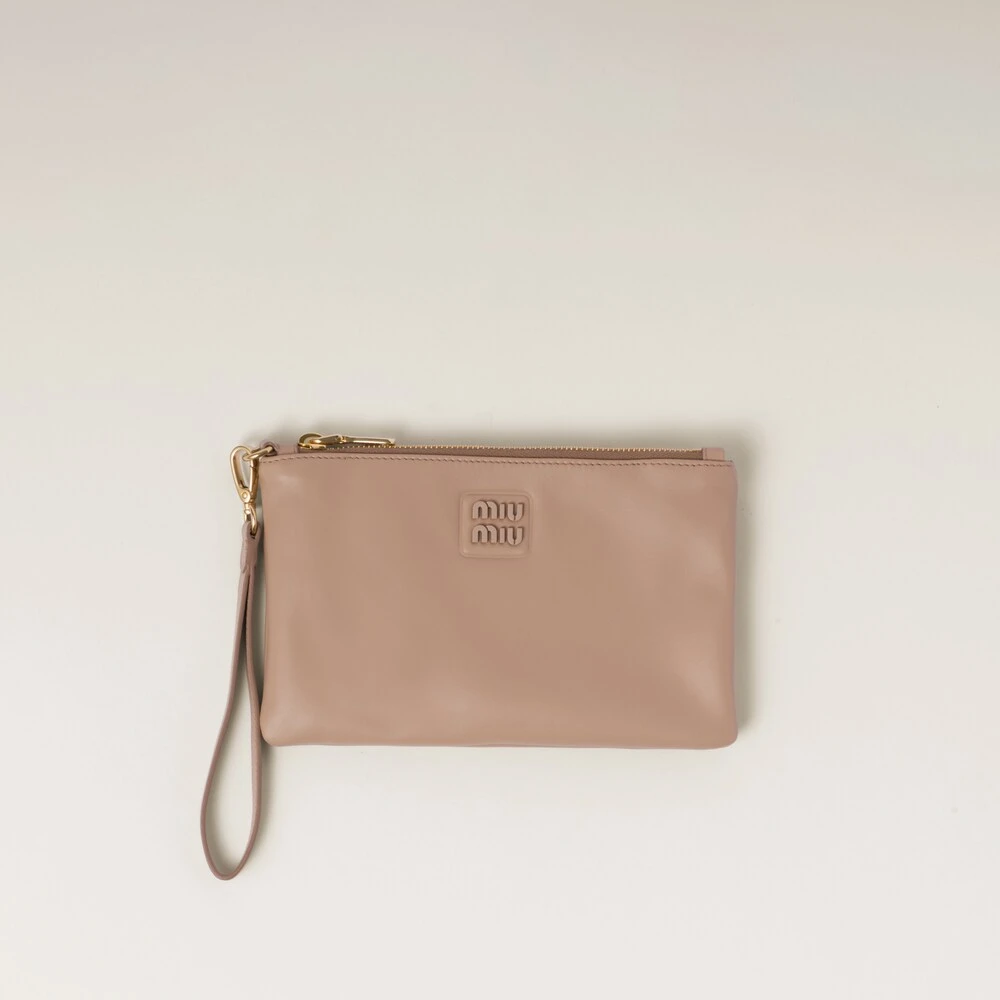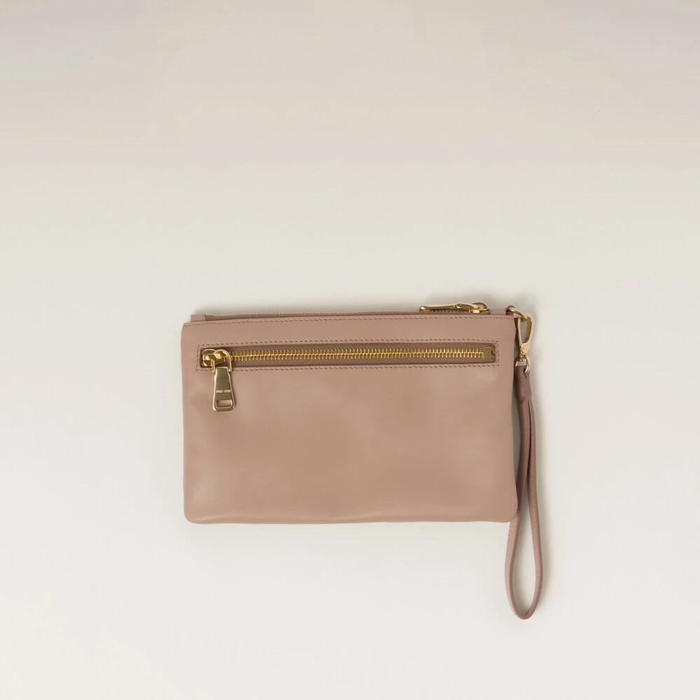 Fine leather is combined with the iconic touch of the Miu Miu metal logo in this new pouch. The compact lines, external zipper pocket, and removable wristlet complete the design and functionality of the accessory.
