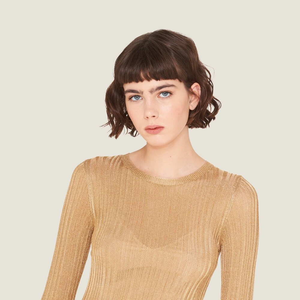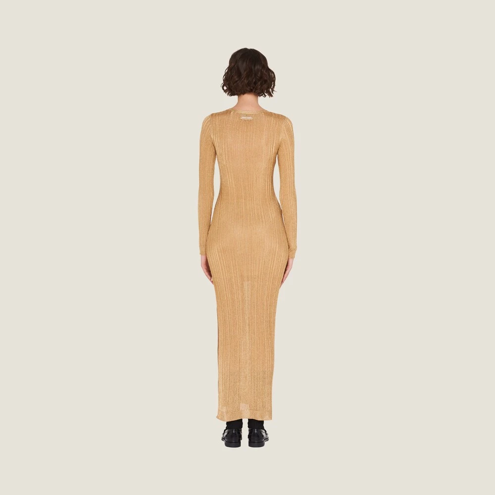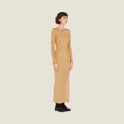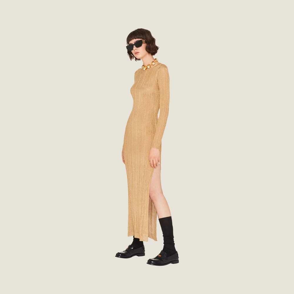 Sophisticated and with a sleek silhouette, this lamé dress has a ribbed knit motif blending everyday and formal elements.