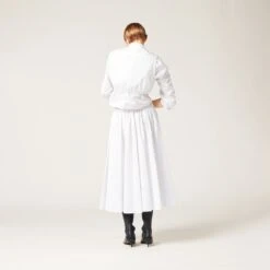 This long poplin skirt expresses dynamic, casual femininity. The elongated lines are crossed by the metal zipper on the front, while the drawstring waist accentuates the casual character of the garment. The embroidered logo completes the design with an iconic note.