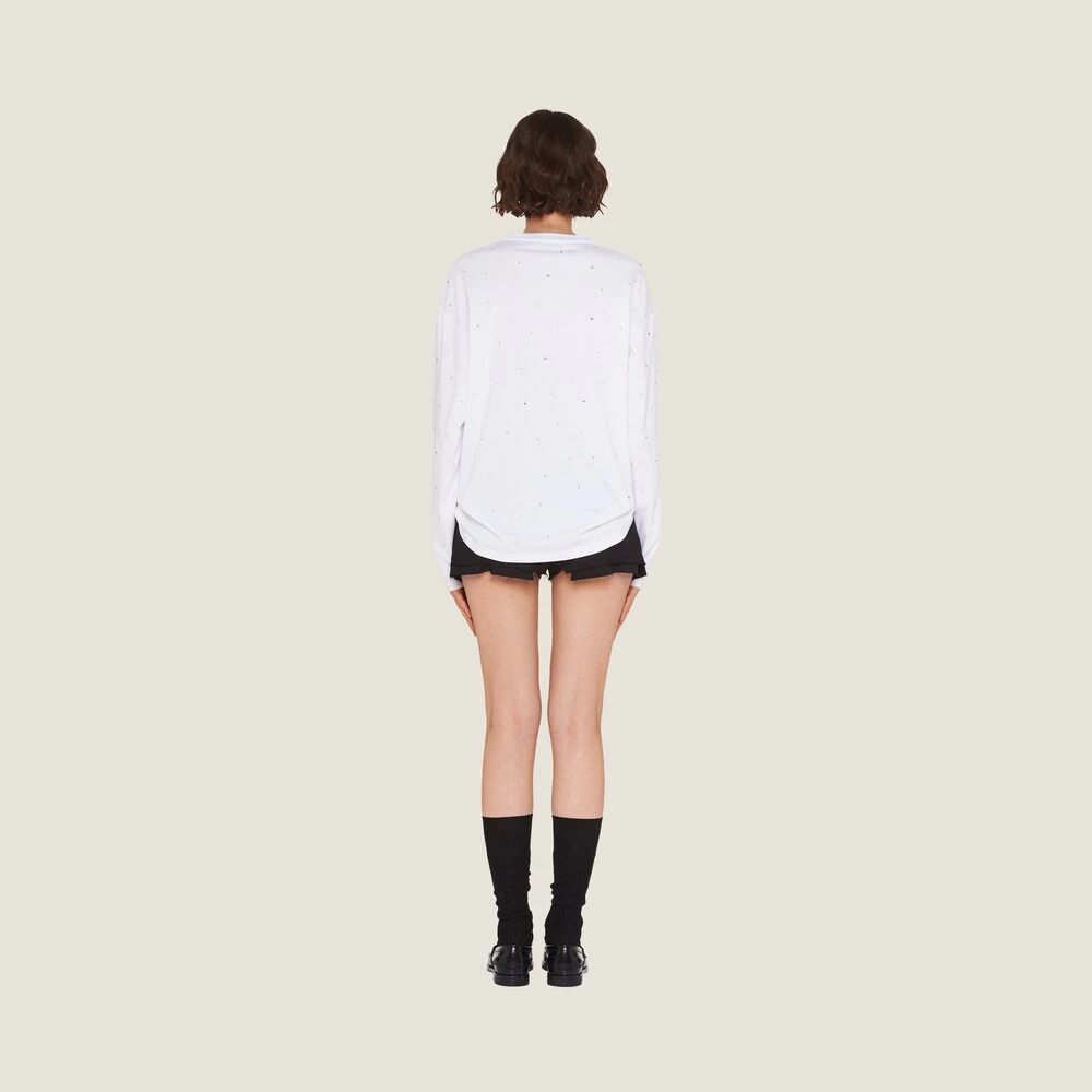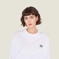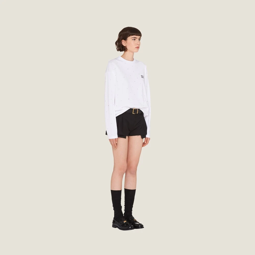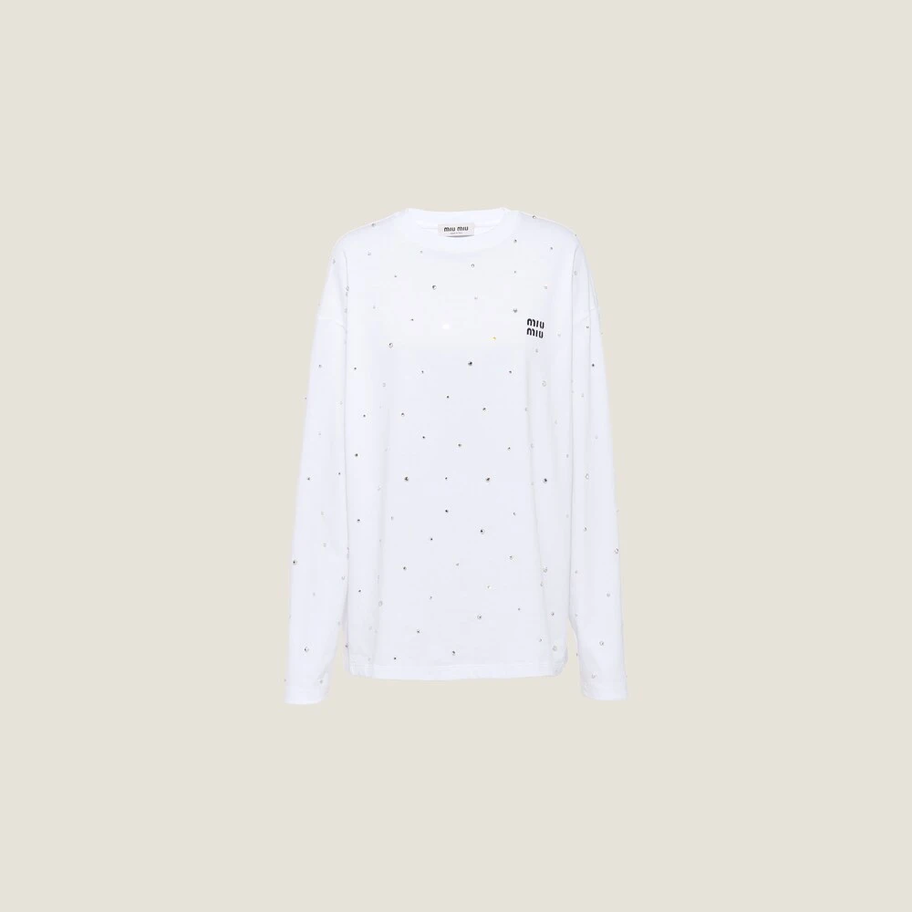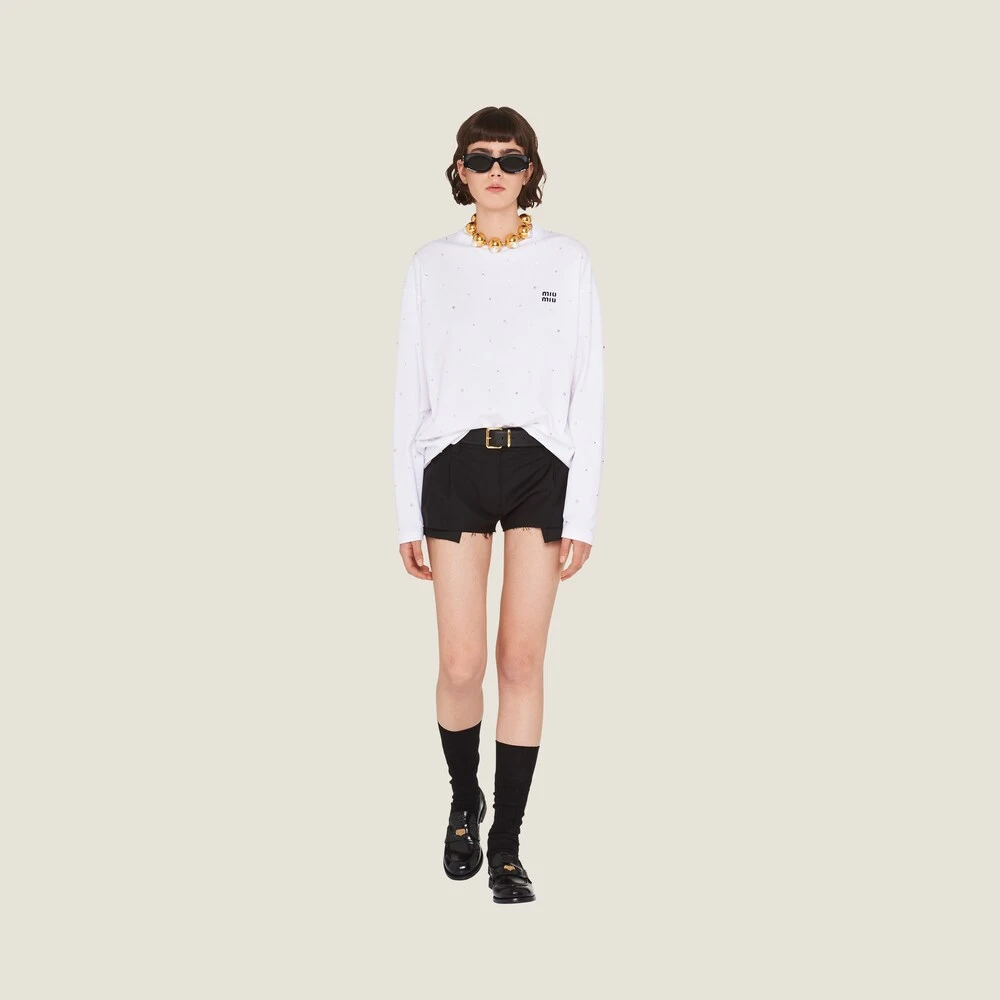 The classic long-sleeve T-shirt is reimagined and embellished with luminous all-over embroidery, blending streetwear influences and sophisticated subversion. Playing with unexpected contrasts and combinations, Miu Miu redefines the concept of contemporary style.