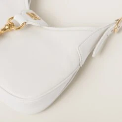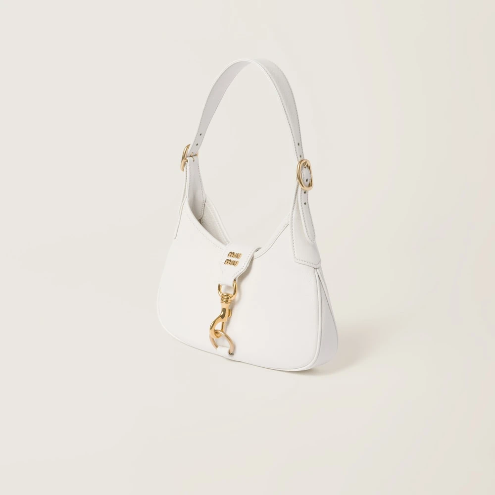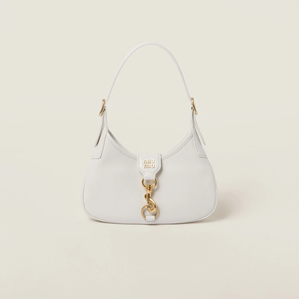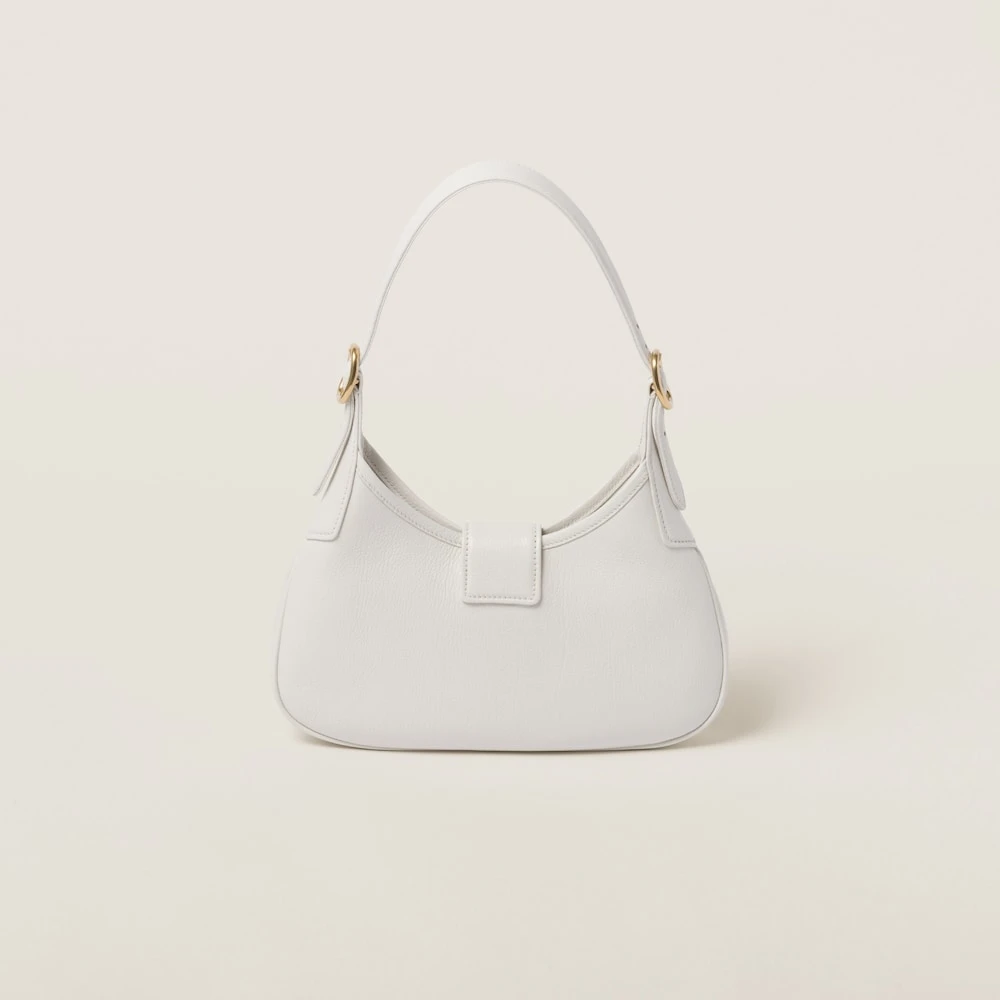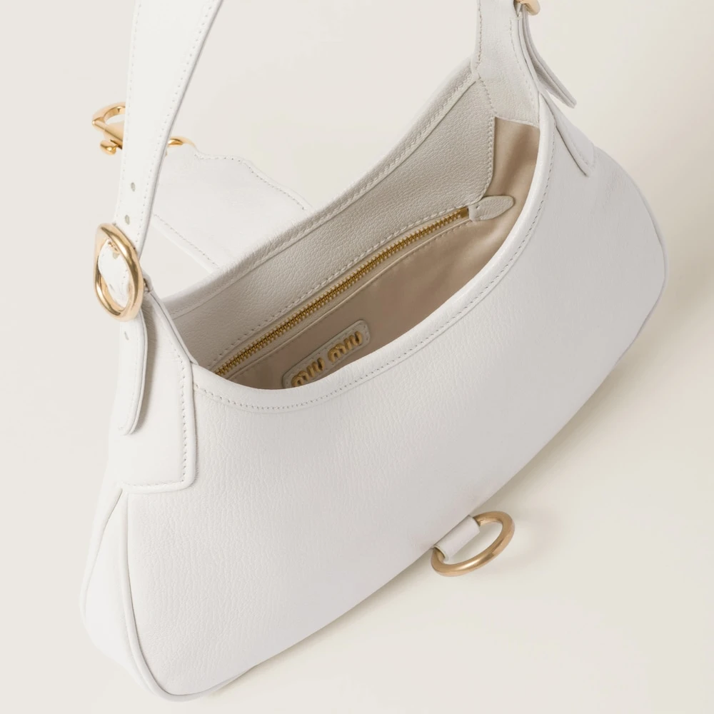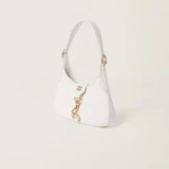 The curved design and fine artisan crafting of this Madras leather hobo bag are enhanced by the brilliant touches of the metal hardware, snap-hook closure, and the logo that completes the aesthetic with an iconic and immediately recognizable note. Miu Miu’s refined style gives a distinctive character to the design of the bag.