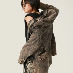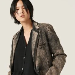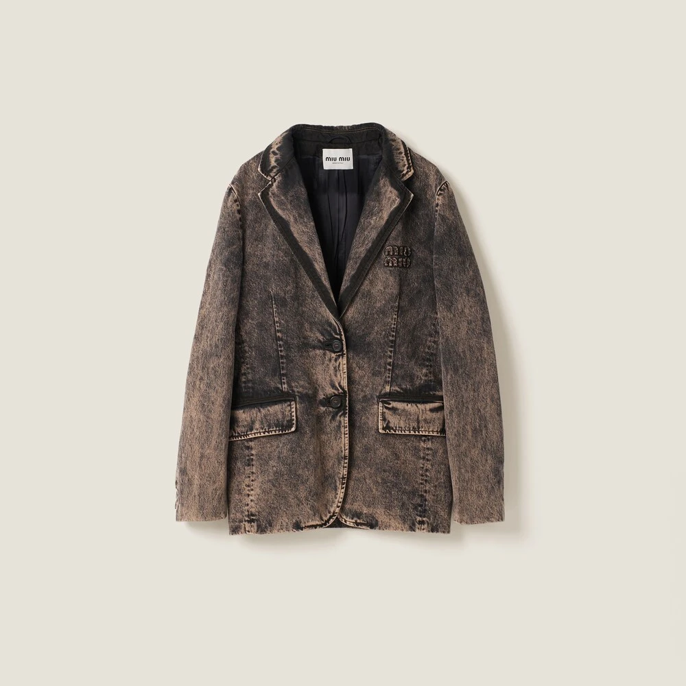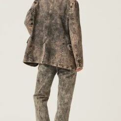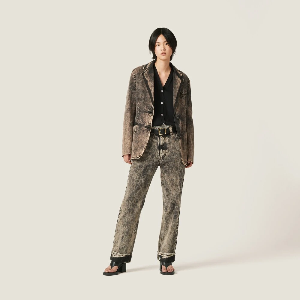 This marbleized denim jacket, seen at the Spring-Summer 2023 show, expresses a notion of fashion as a means of translating a reaction to current reality into material form. Echoes of classic garments linked to the tailored jacket re-emerge and are renewed thanks to unexpected techniques that subvert stylistic codes. The embroidered logo decorates the garment with an original, iconic, and distinctive aesthetic.