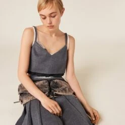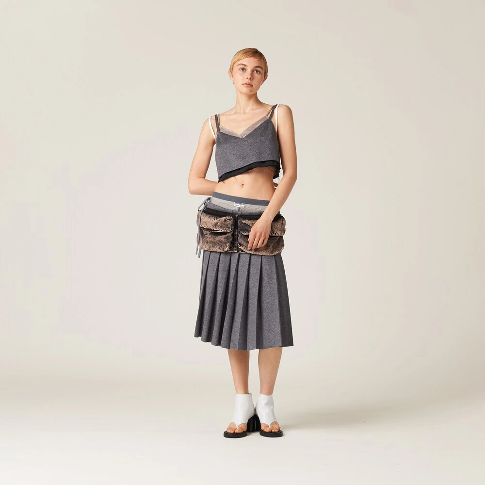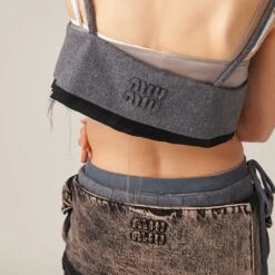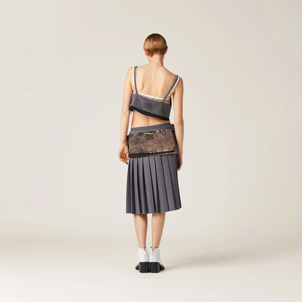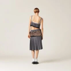 New to the collection and already iconic. During the Spring Summer 2023 show, this marbleized denim peplum belt represented a concept of fashion as an integral part of real life where utility, benefit, and service affect physical expression. The roomy zipper pouch pockets, inspired by the utility world, are an expression of practicality and border between decoration and function. The embroidered logo decorates this new vision of style. The special marbleized treatment gives the fabric a lightly ombré effect while the refined details define an original and distinctive aesthetic.
