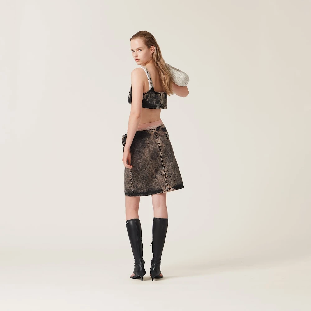 During the Spring-Summer 2023 show, this marbleized denim skirt represented a concept of fashion as an integral part of real life where utility, benefit, and service affect physical expression. The timeless character of denim is combined with elongated lines and the irreverent Miu Miu attitude to create a distinctive design. The embroidered logo decorates this new vision of style.