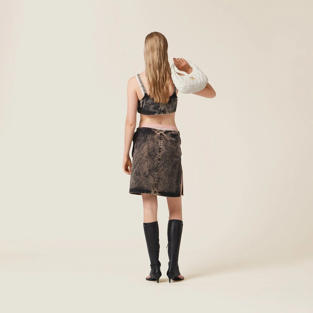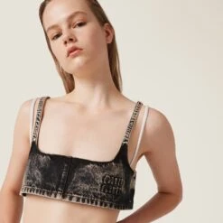 New to the collection and already exquisitely iconic. During the Spring Summer 2023 show, this marbleized denim top represented a concept of fashion as an integral part of real life where utility, benefit, and service affect physical expression. The crop cut is perfect for sophisticated layering effects to create an extremely contemporary silhouette. The logo patch decorates this new vision of style.