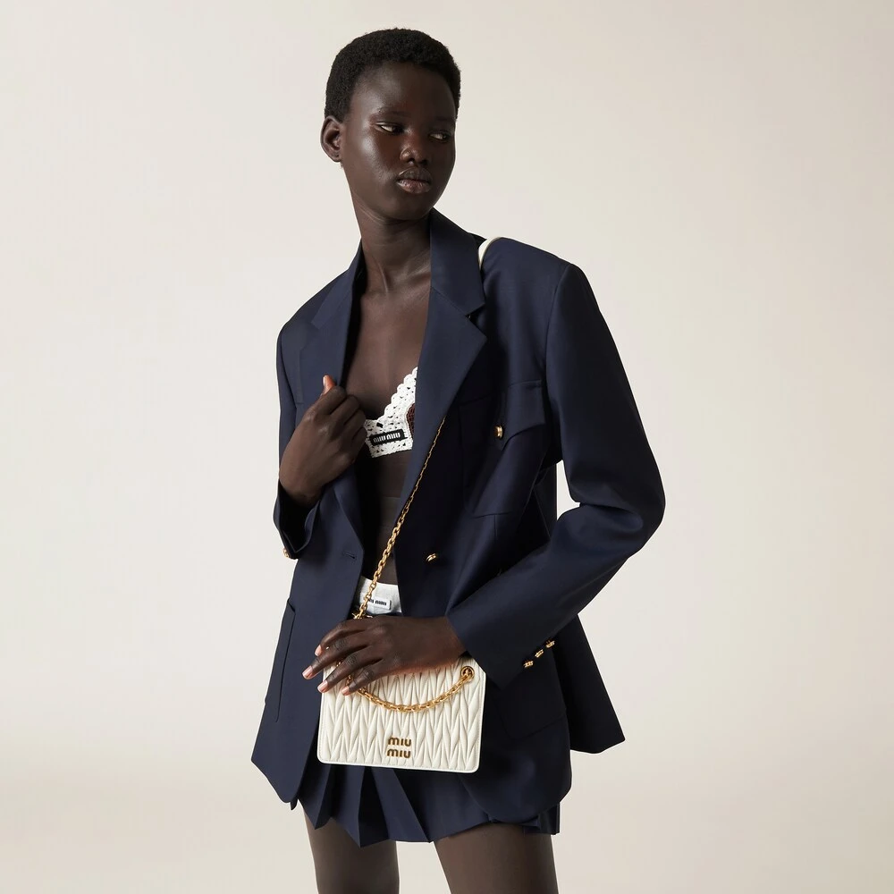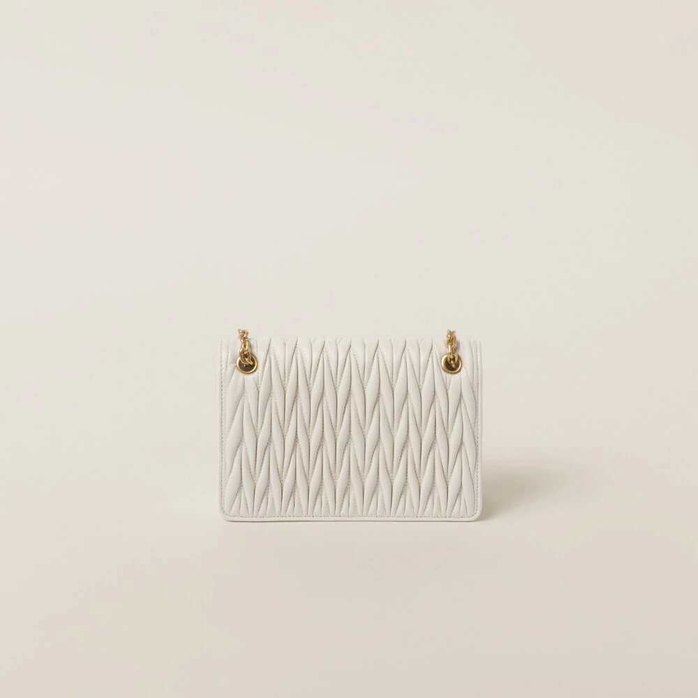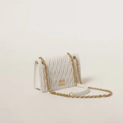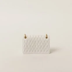 Fine matelassé workmanship creates an extremely sophisticated, textured, and three-dimensional effect on this new nappa leather mini-bag. The lettering logo on the flap, which echoes the different metallic finishes of the hardware, stands out against the refined artisan workmanship with an iconic and immediately recognizable feel. The elegant and compact silhouette, the chain shoulder strap with shoulder pad, and the magnet closure complete the design of this bag with functional and aesthetic details.