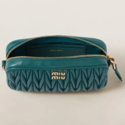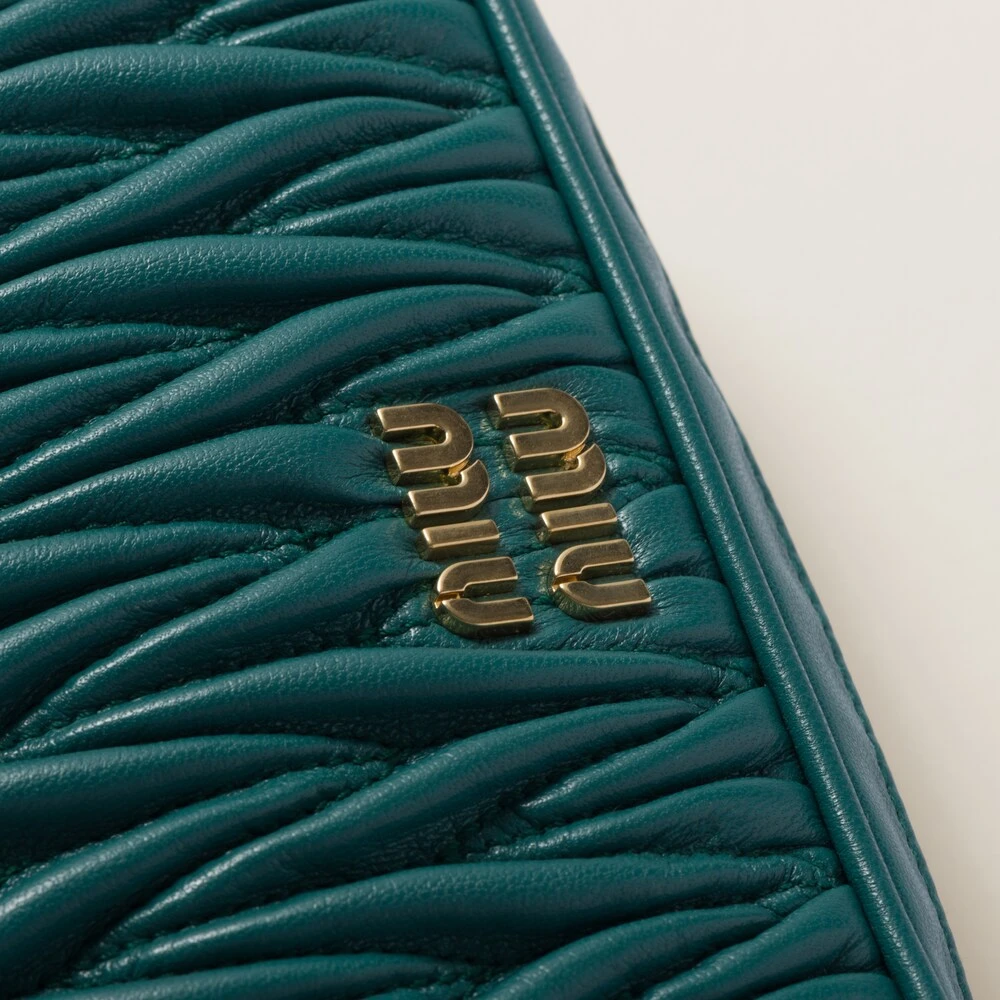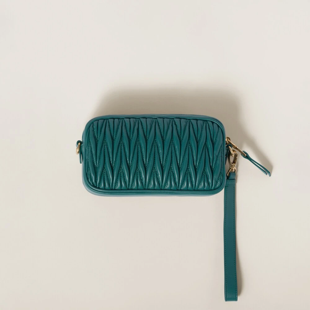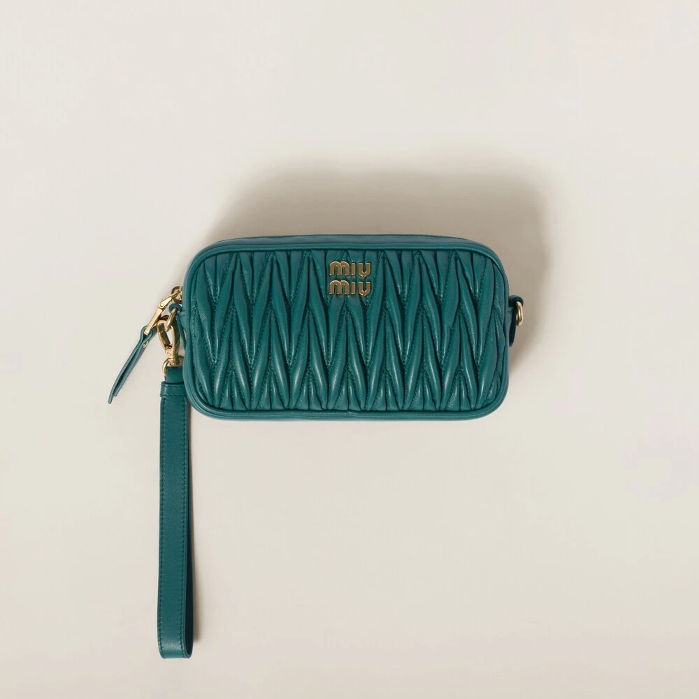 Thanks to its three-dimensional, textured, and extremely sophisticated effect, fine matelassé workmanship gives a modern, compact look to this nappa leather pouch. The Miu Miu logo stands out with an iconic and instantly recognizable touch.