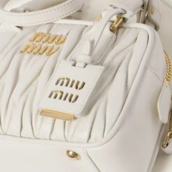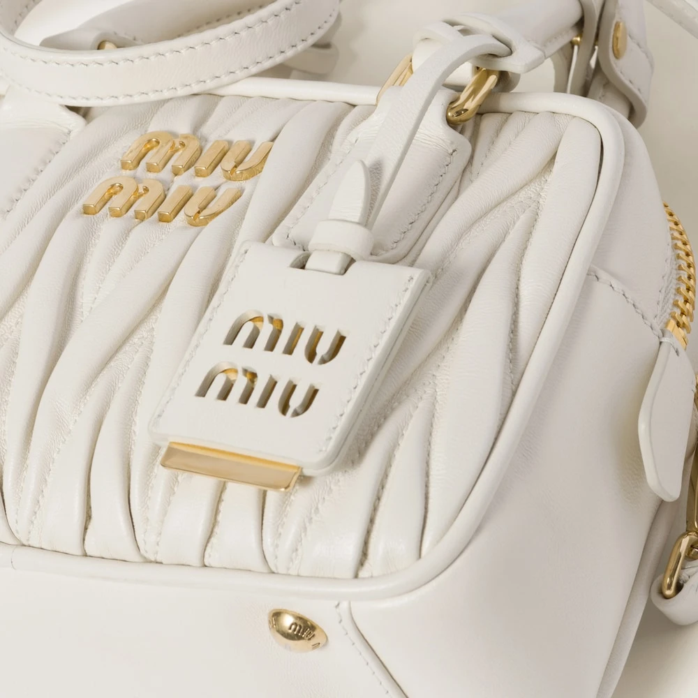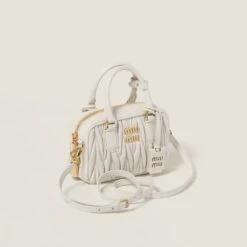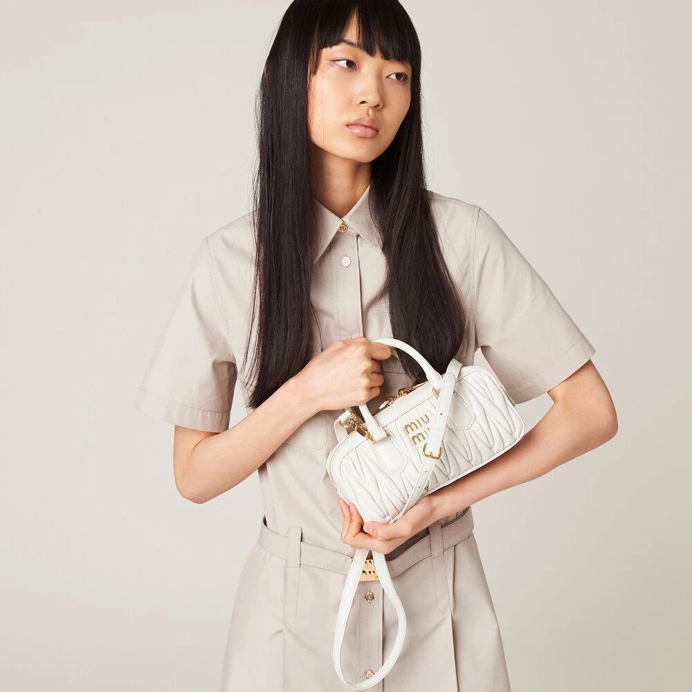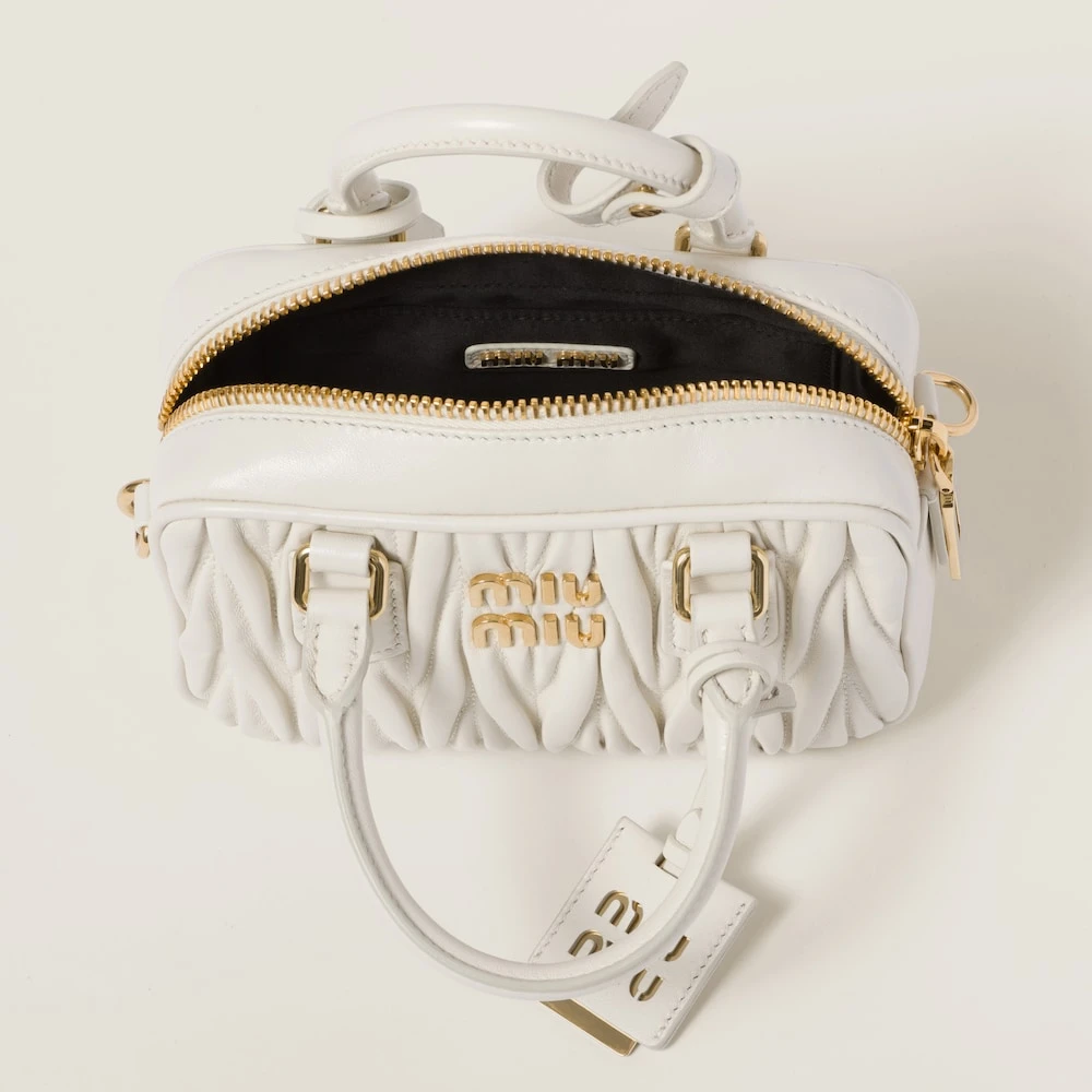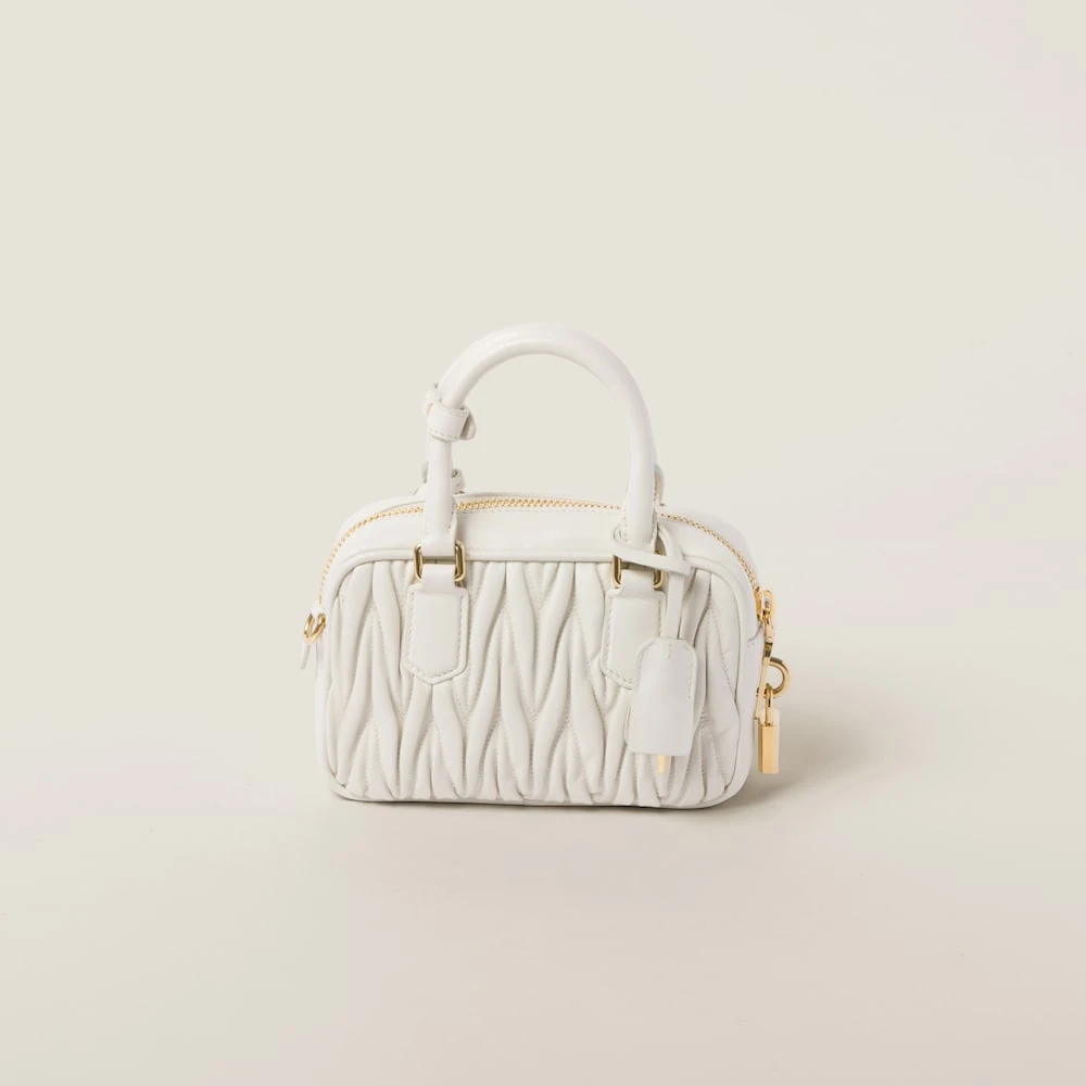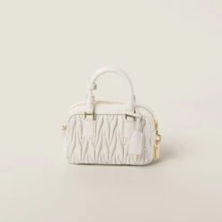 A luxurious matelassé motif reinterprets the classic silhouette of the top-handle bag through its three-dimensional, textured, and extremely sophisticated effect. The lettering logo on the front, which echoes the different metallic finishes, stands out against the refined artisan-crafted motif with an iconic and immediately recognizable touch. The dynamic, compact and elegant lines and the zipper closure with lock contribute to the versatile, feminine, and modern design of the bag.
