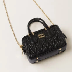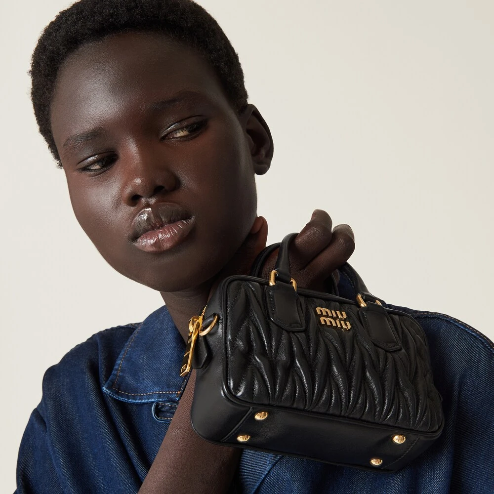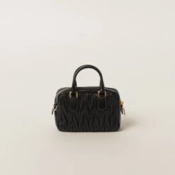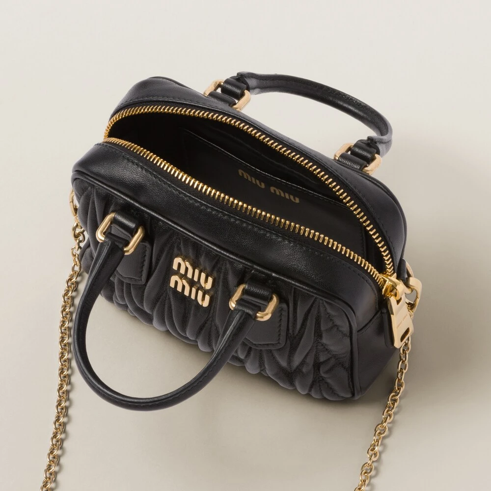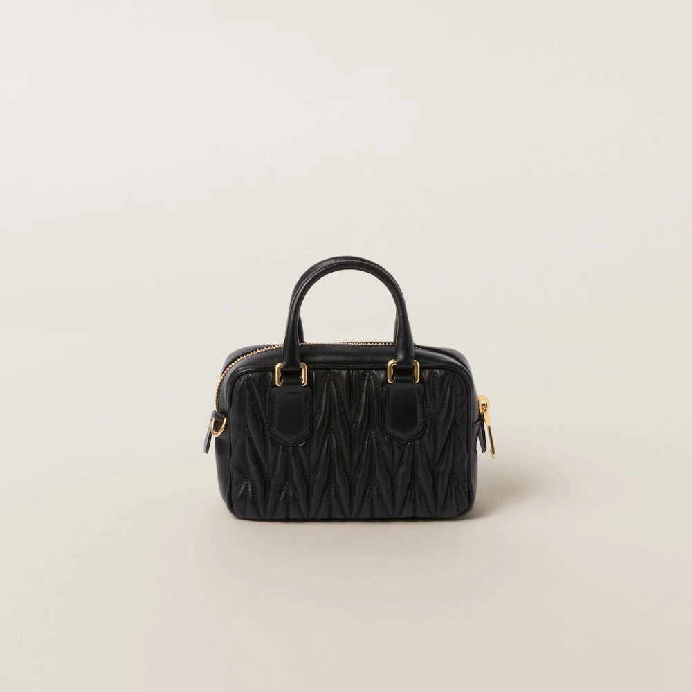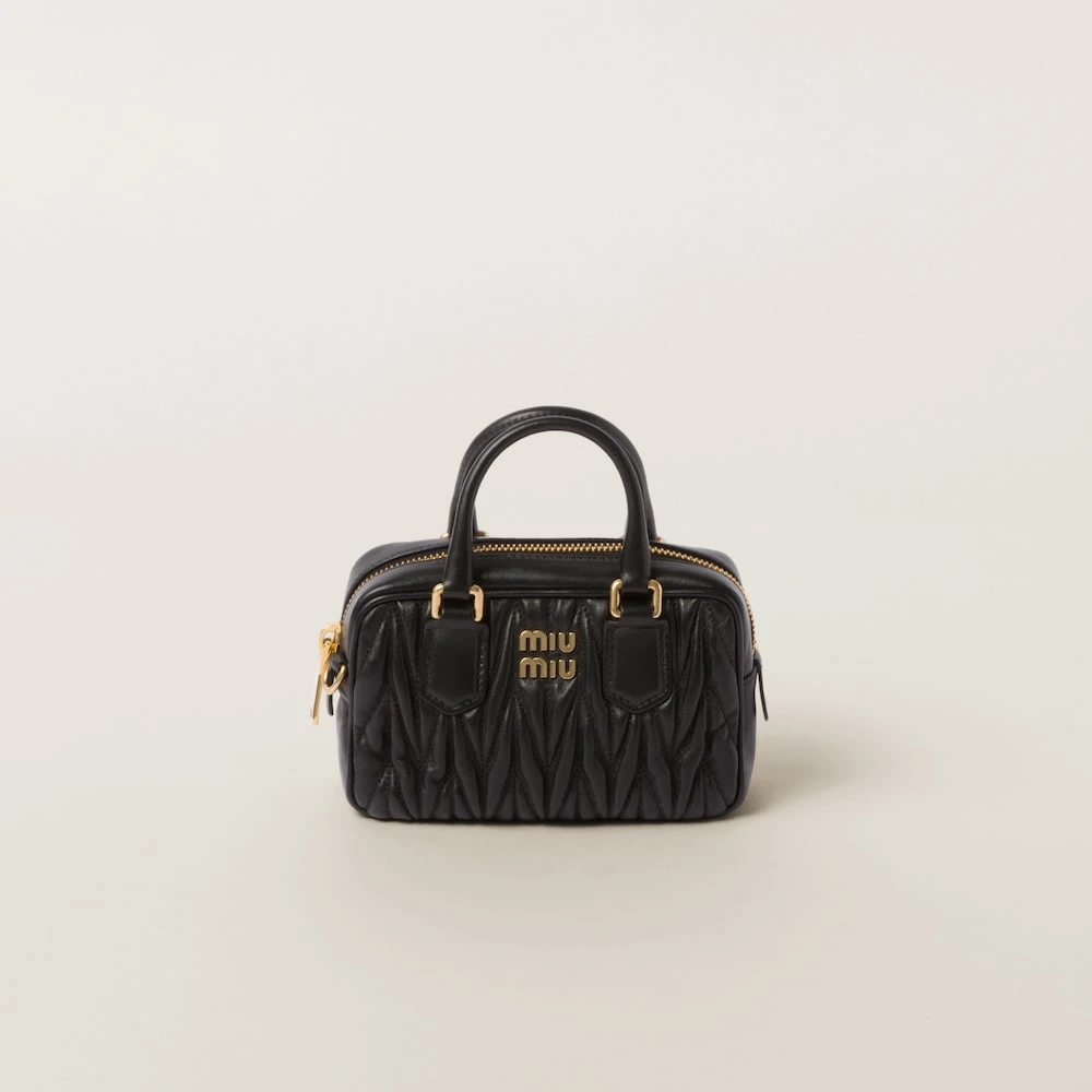 Miu Miu revisits classic codes, plays with iconic shapes, and reimagines functions. Made of matelassé nappa leather, a Miu Miu hallmark, this top-handle mini-bag blends day and night, becoming a versatile accessory of great modernity and elegance. Sophisticated color details brighten the bag.