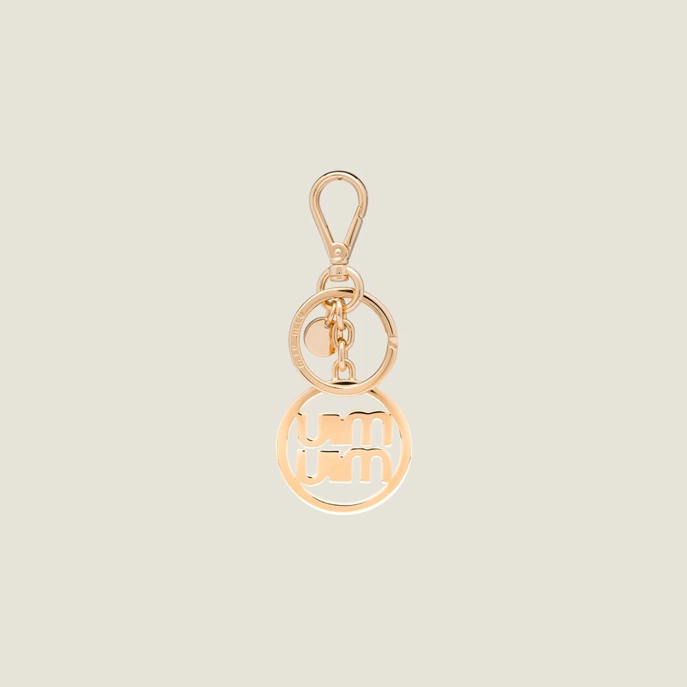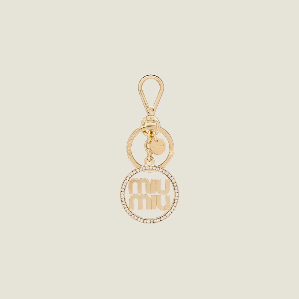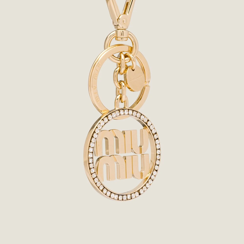 The iconic Miu Miu logo is the protagonist in the sophisticated design of this keychain with gold-tone finish illuminated with mounted crystals.