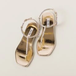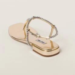 Bold-feminine lines characterize these new thong sandals in metallic leather. The shiny effect of the refined material is combined with the sparkling details that add brilliant touches to the style.