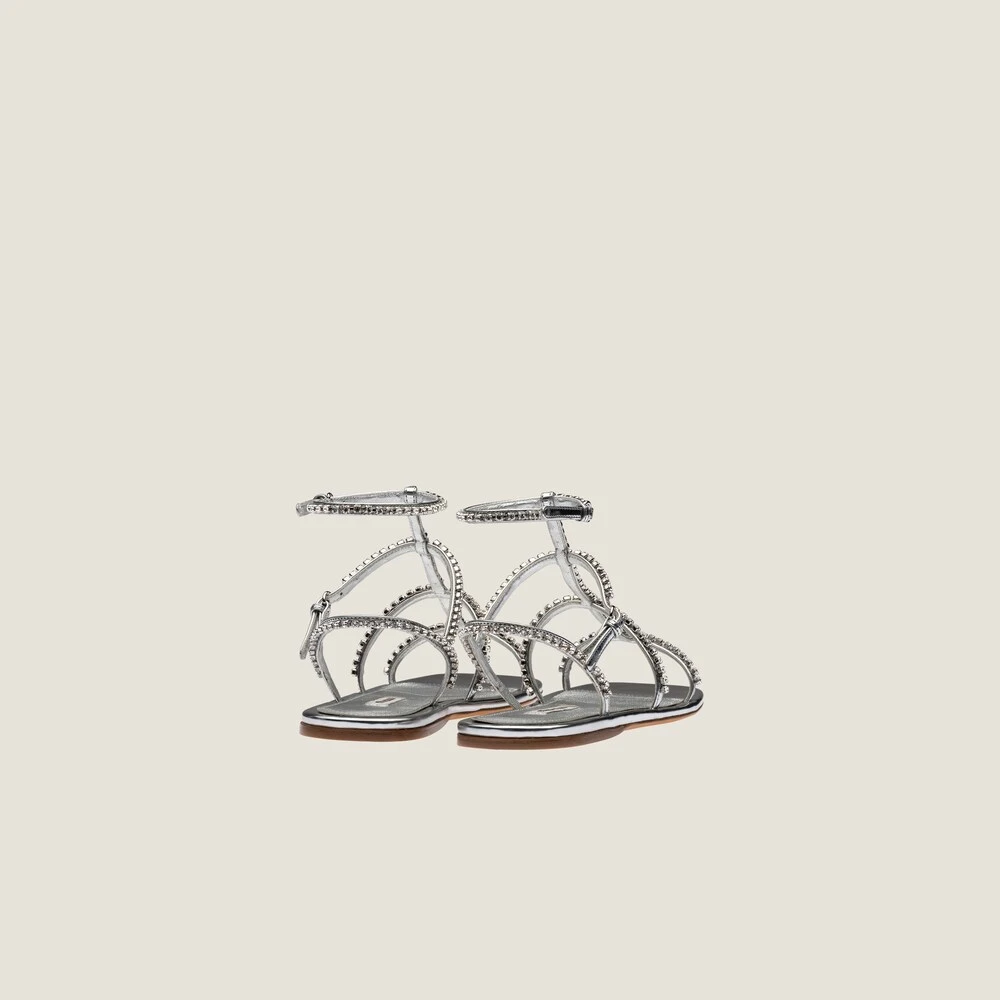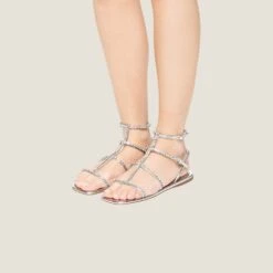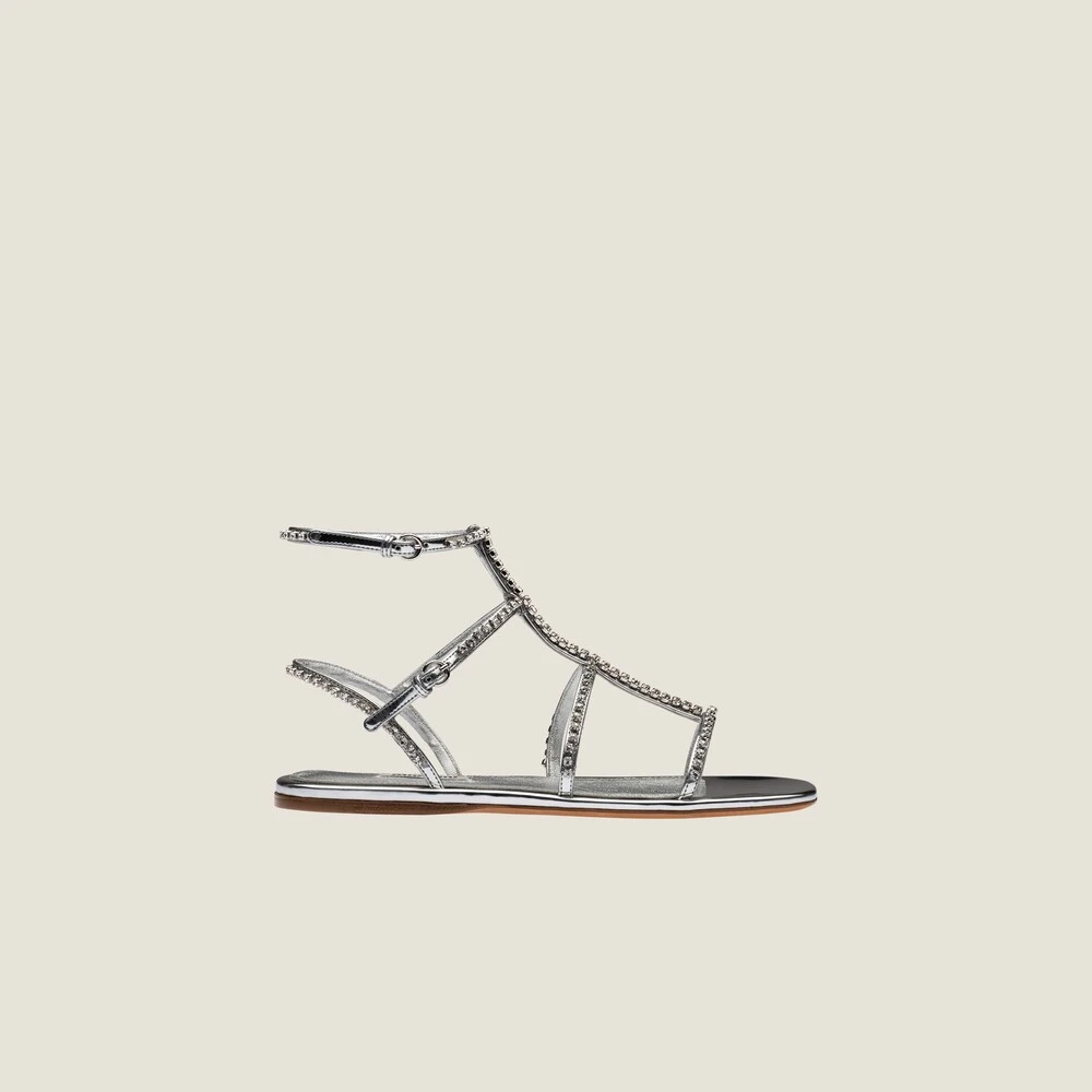 These shiny metallic technical fabric sandals combine a casual mood and enchanting allure. A scattering of crystals decorates the strappy upper.