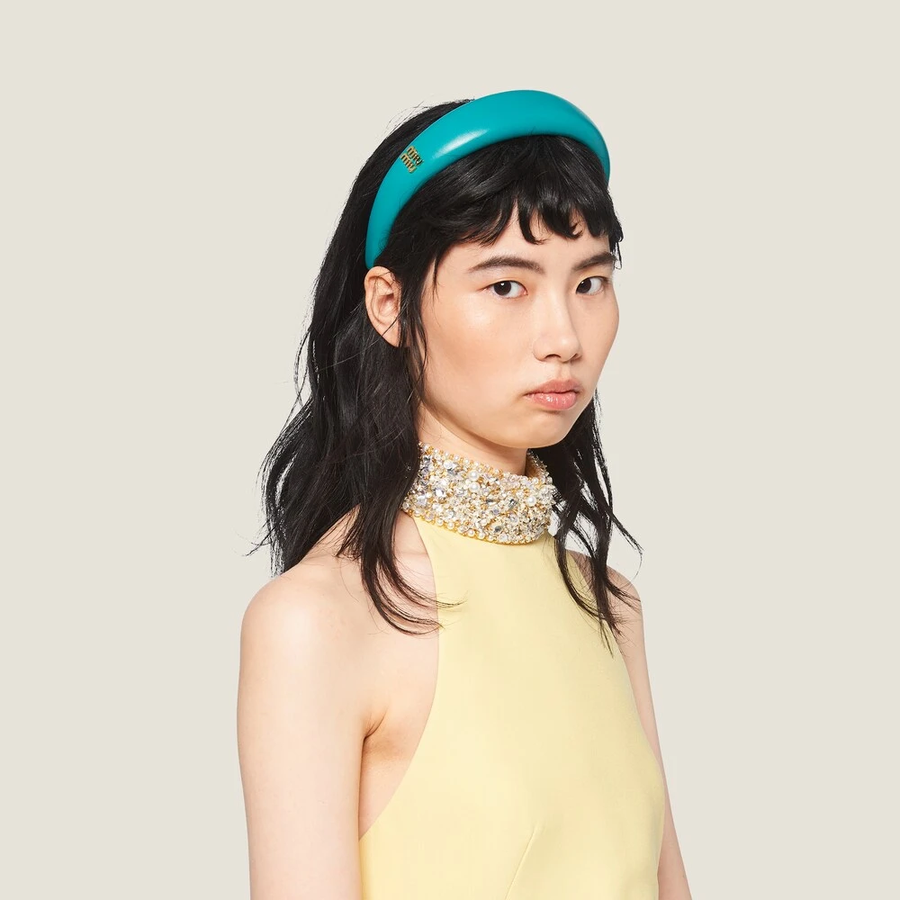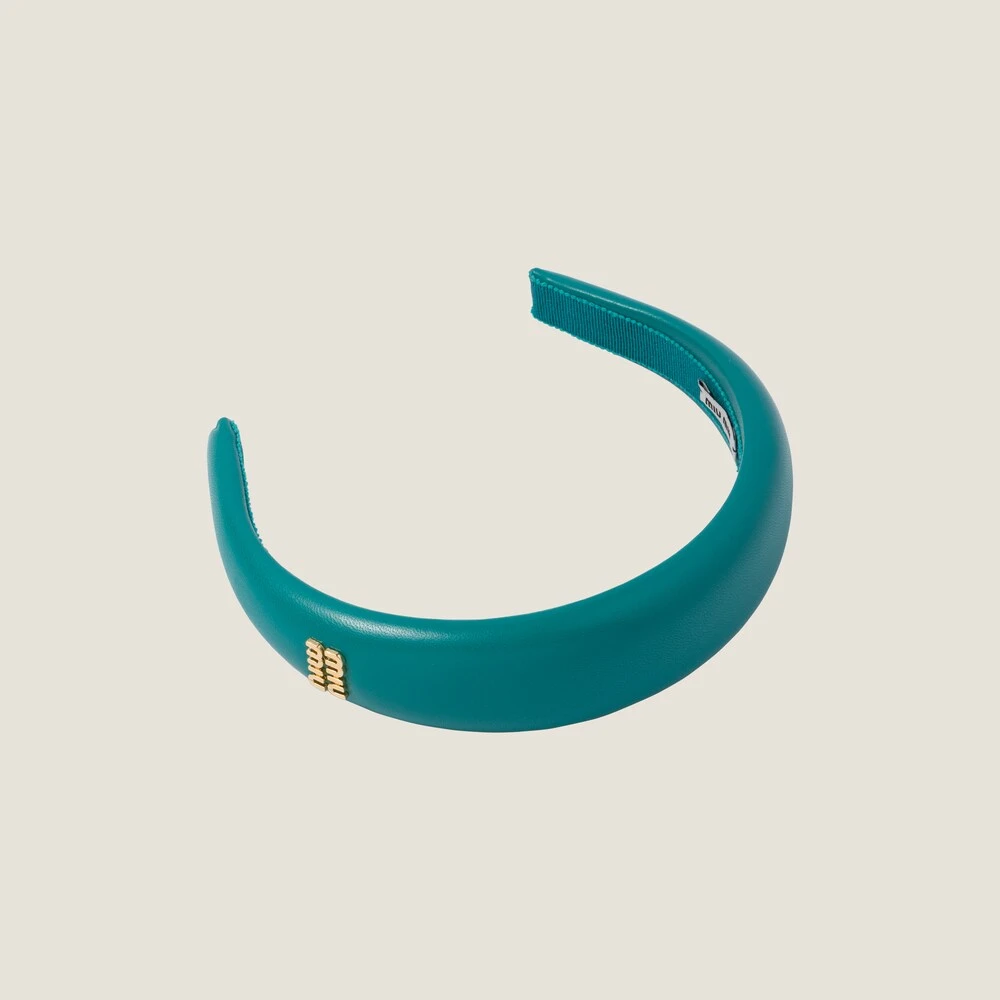 Among the essential accessories of Miu Miu collections, this nappa leather headband stands out for the lettering logo that decorates the design, adding an iconic note.