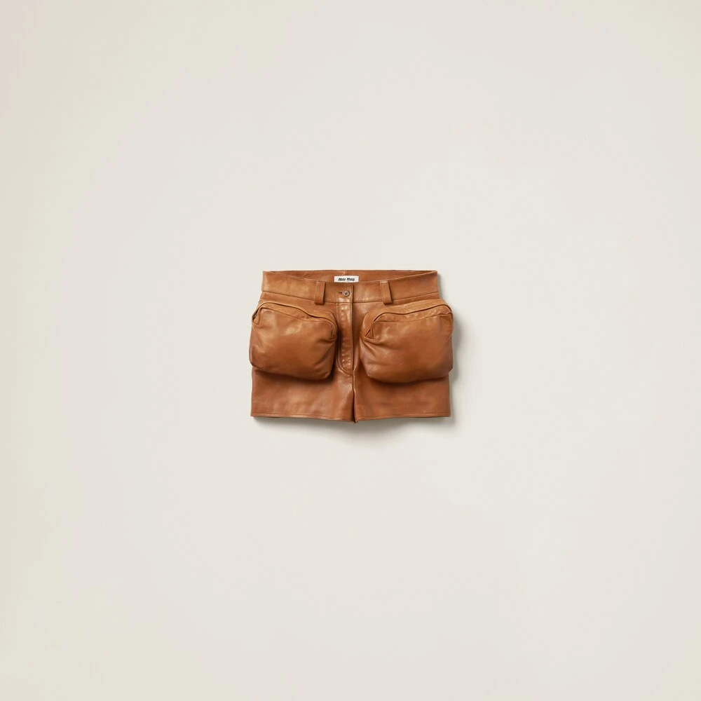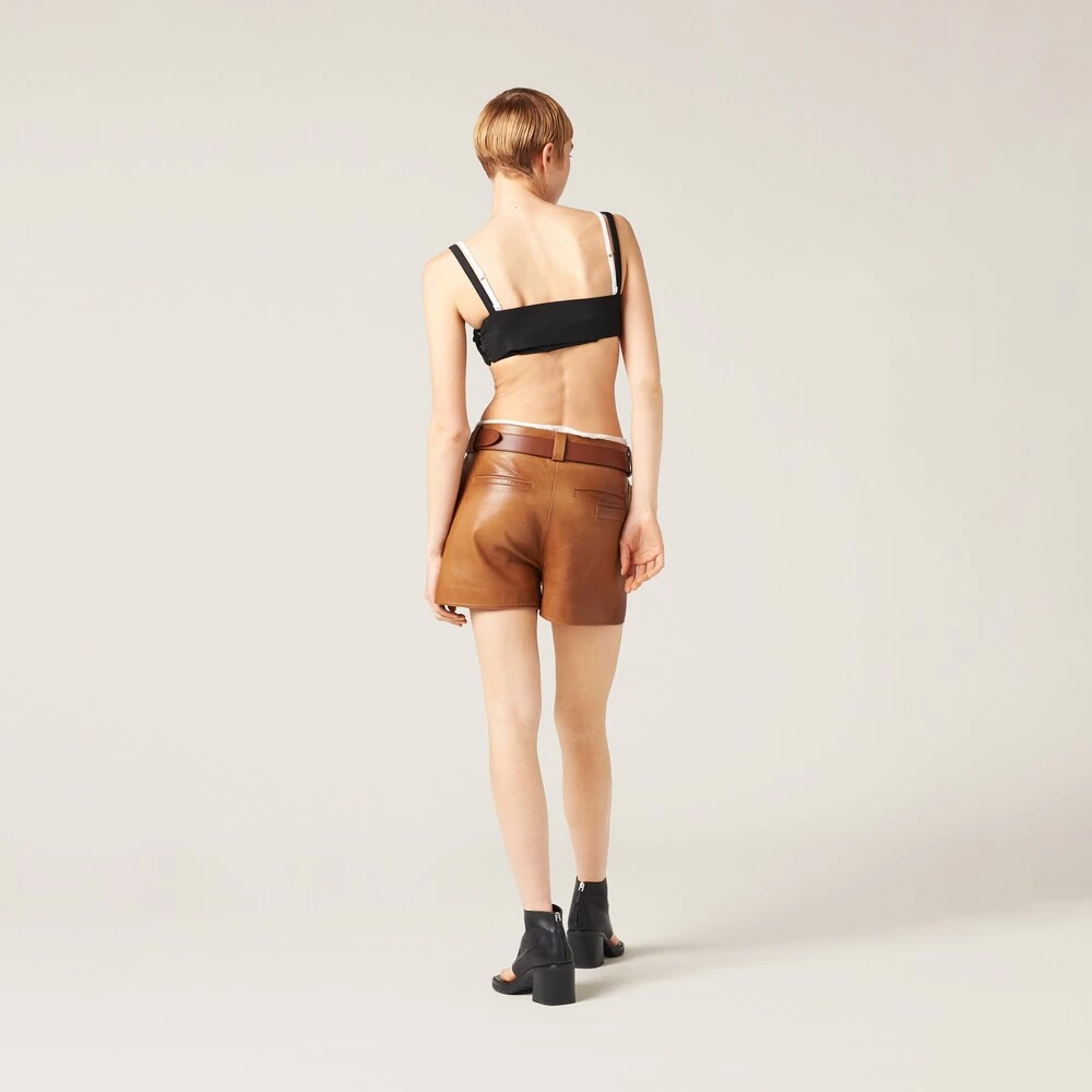 New to the collection and already iconic. During the Spring Summer 2023 show, these nappa leather shorts represented a concept of fashion as an integral part of real life where utility, benefit, and service affect physical expression. The roomy zipper pouch pockets, inspired by the utility world, are an expression of practicality and border between decoration and function. The hot-stamped logo patch decorates this new vision of style. The solarized treatment gives the garment a deliberately lived-in look while the refined details define an original and distinctive aesthetic.