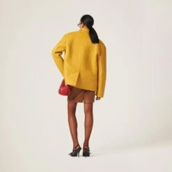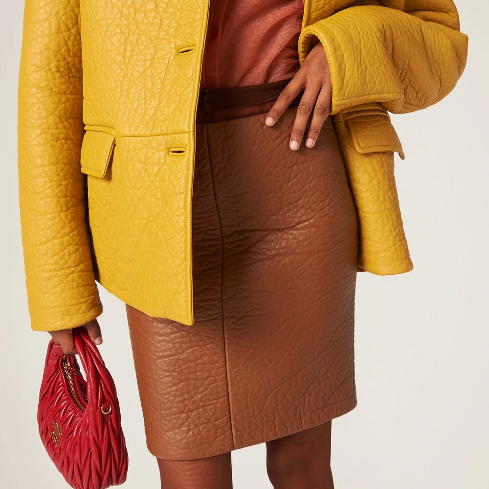 A vintage inspiration meets modern character in this nappa leather skirt. The bonded leather gives the garment a lived-in look while the back slit adds movement to the silhouette.