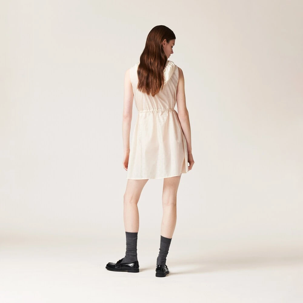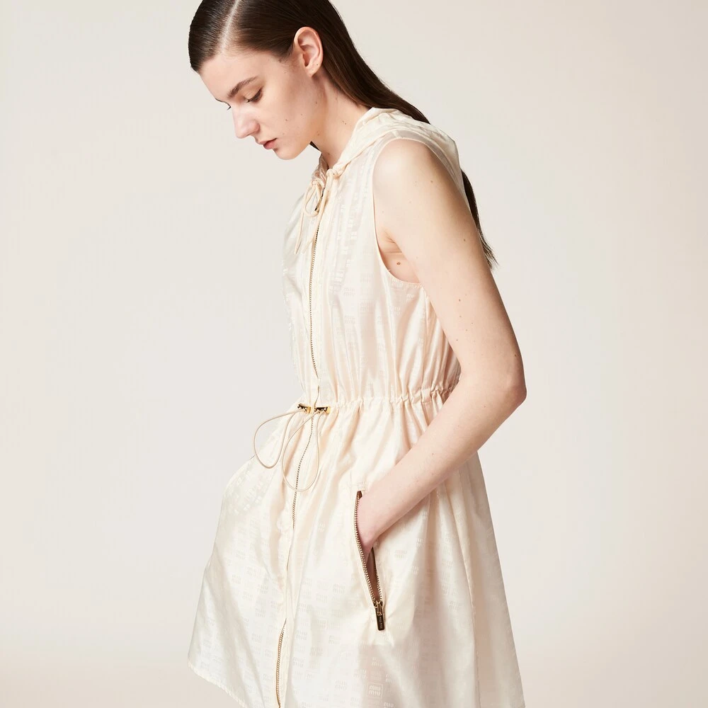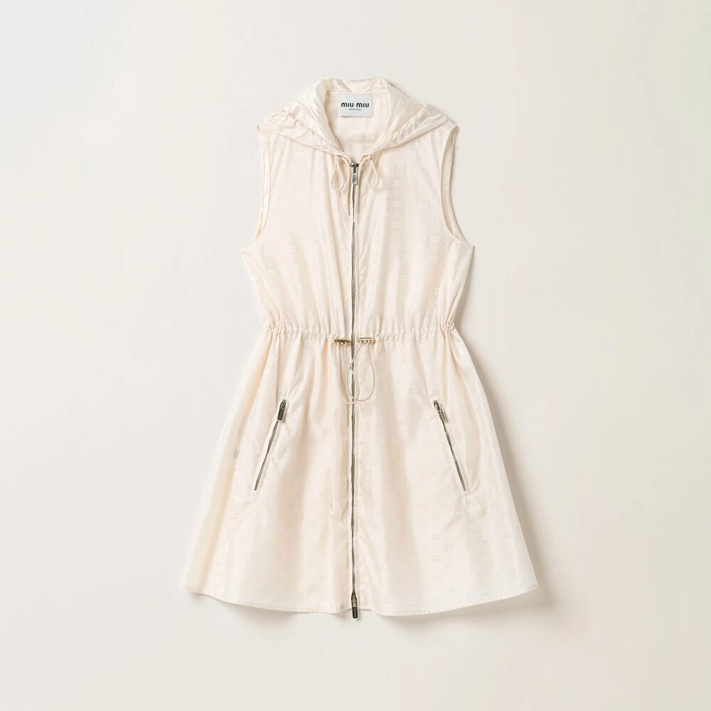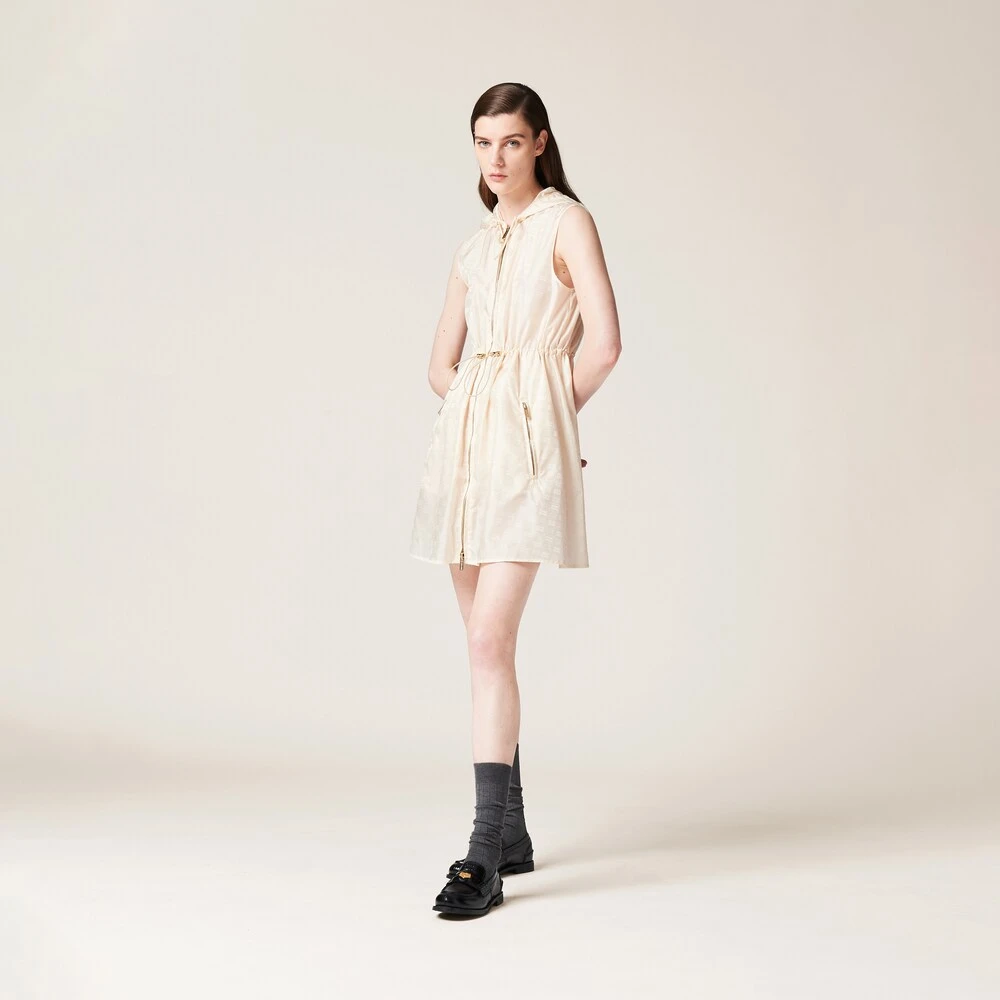 This nylon mini-dress has a distinctively casual and sporty design inspired by utility wear. The extremely light fabric features different metallic details, a drawstring cinching the waist, and a hood that accentuates its informal style. Its mini silhouette accentuates Miu Miu’s dynamic and irreverent femininity.