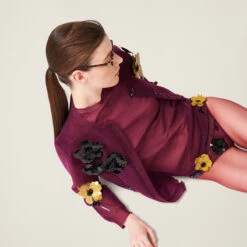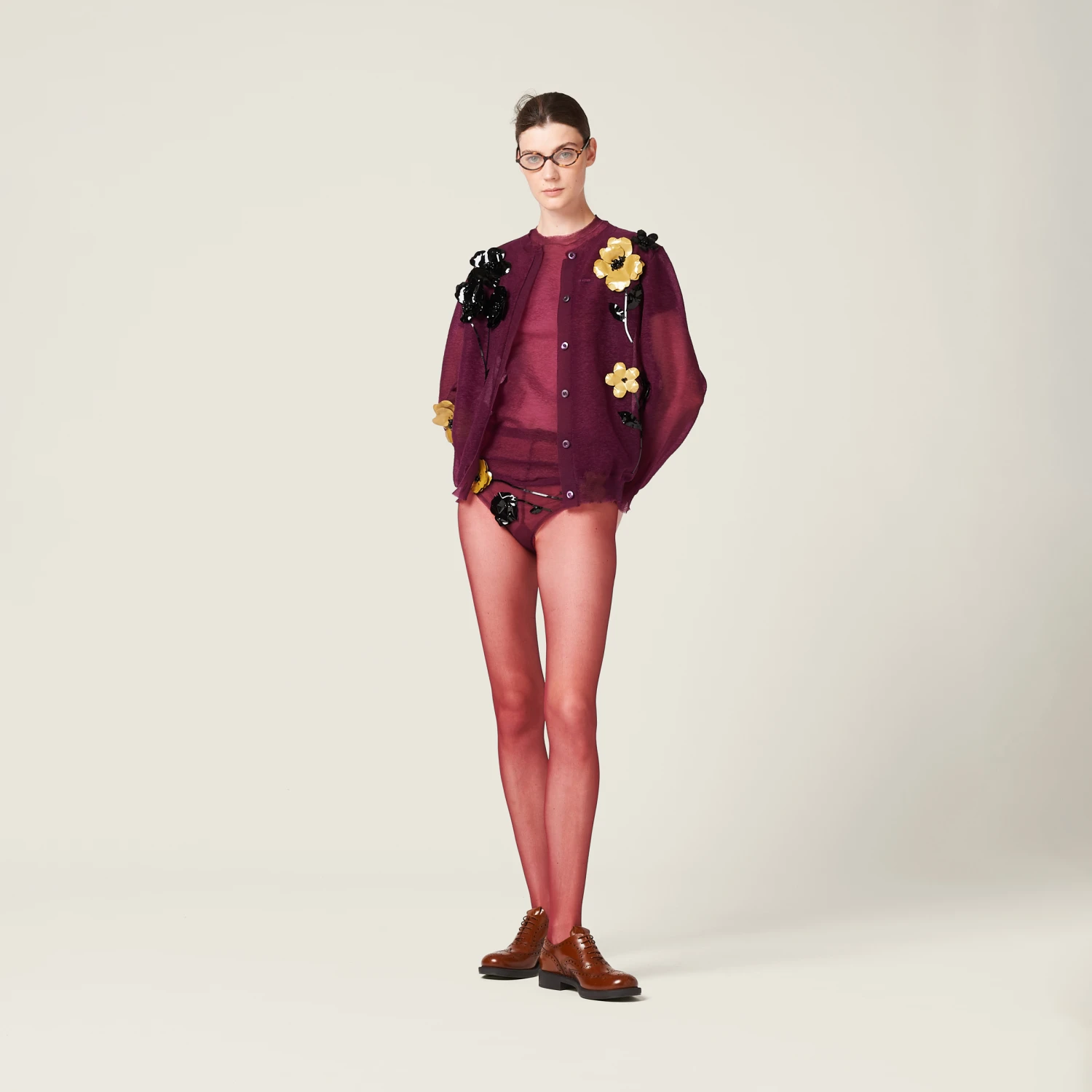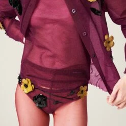 A luxurious hand-made floral embellishment decorates these nylon panties. The floral embroidery introduces a lively note and a chromatic and textural contrast that catches the eye. The logo patch completes this vision of style.