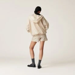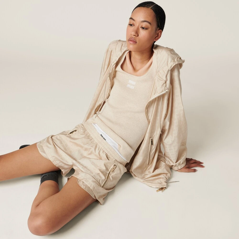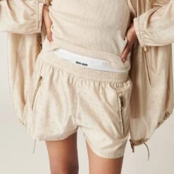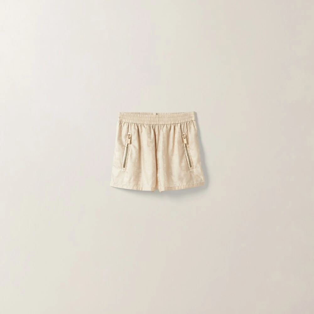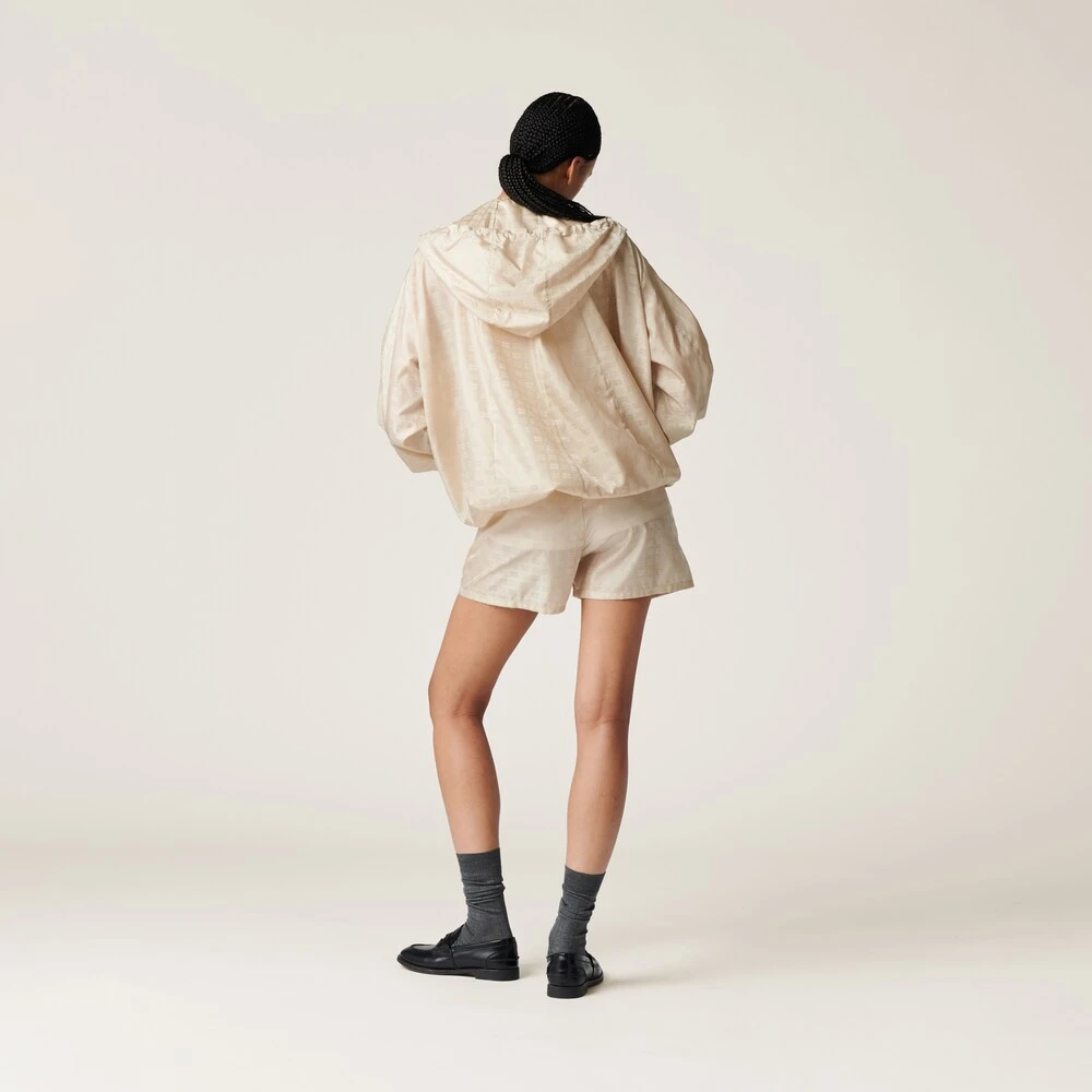 A casual style inspired by utility wear characterizes these nylon shorts. The endlessly repeated logo woven in the fabric gives the garment a distinctive personality. The elasticized waistband and zipper pockets add sporty details to the garment.