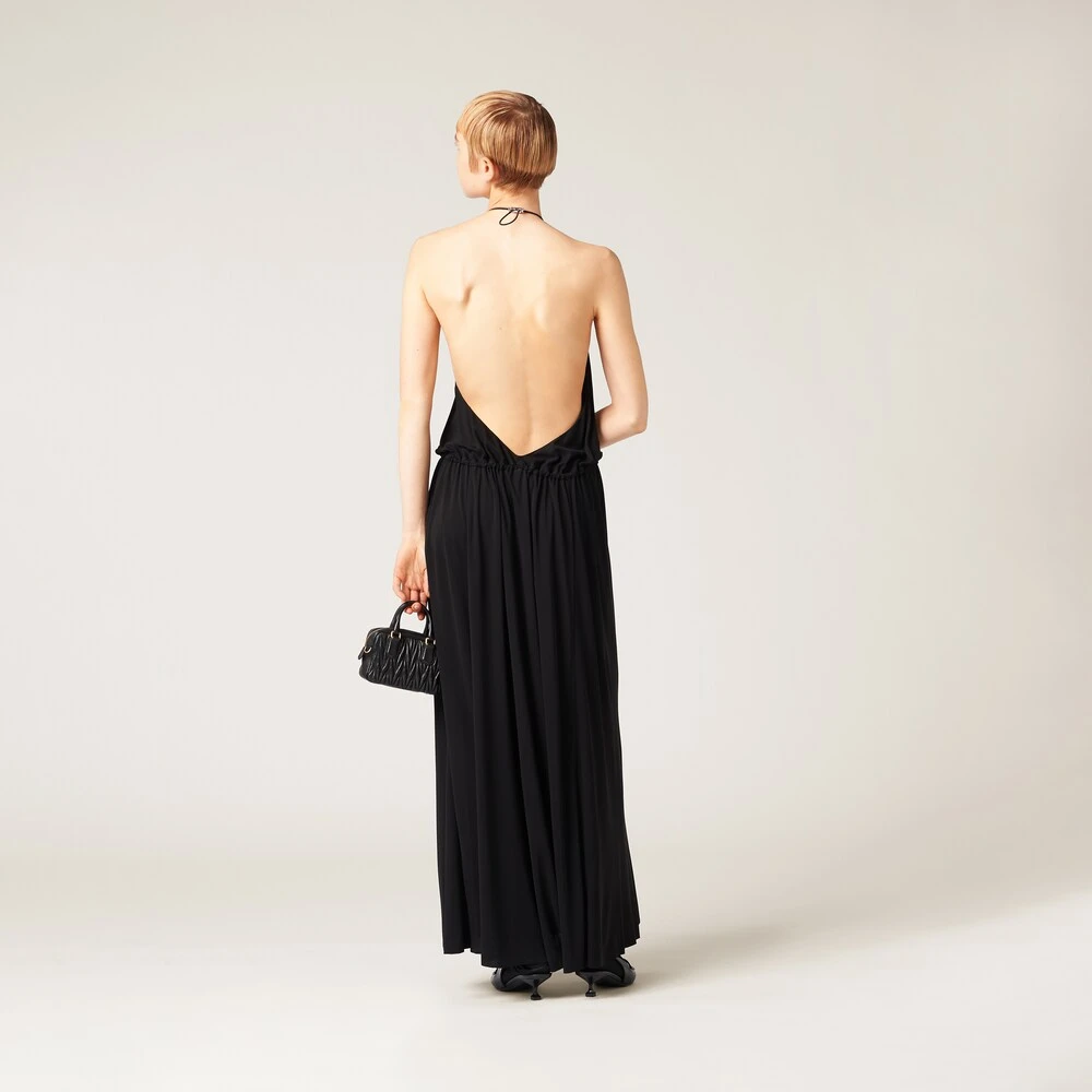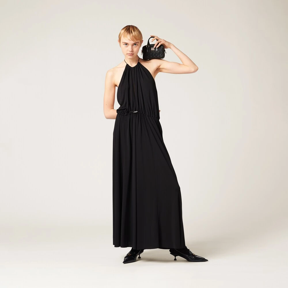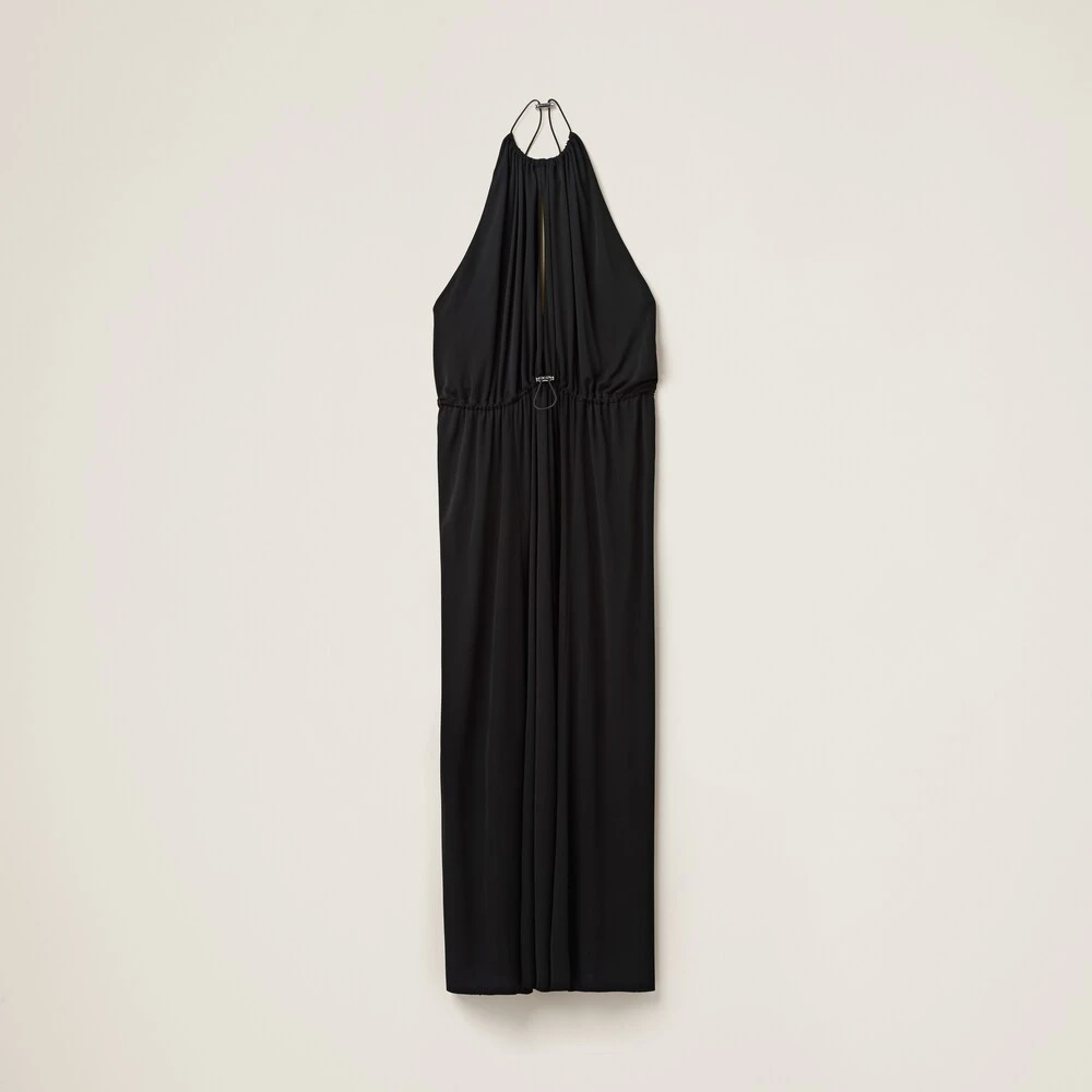 Refined elegance and a bold character characterize the new organzine dress. The elongated lines with refined style coexist with sporty details such as the adjustable drawstring on the neck and waist. The bare shoulder helps convey charismatic femininity.