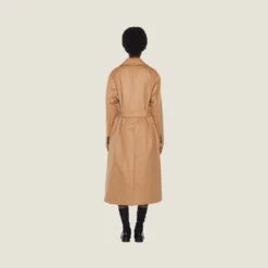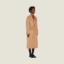 This camel velour coat with a straight oversized silhouette comes with a removable belt for wearing in different ways. The finely embroidered lettering logo stands out on the front pocket, adding an iconic note.