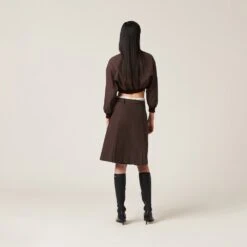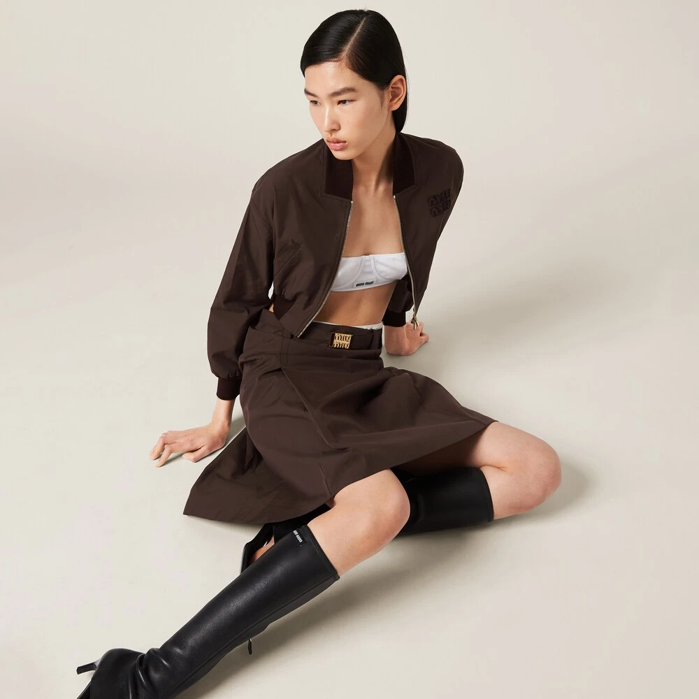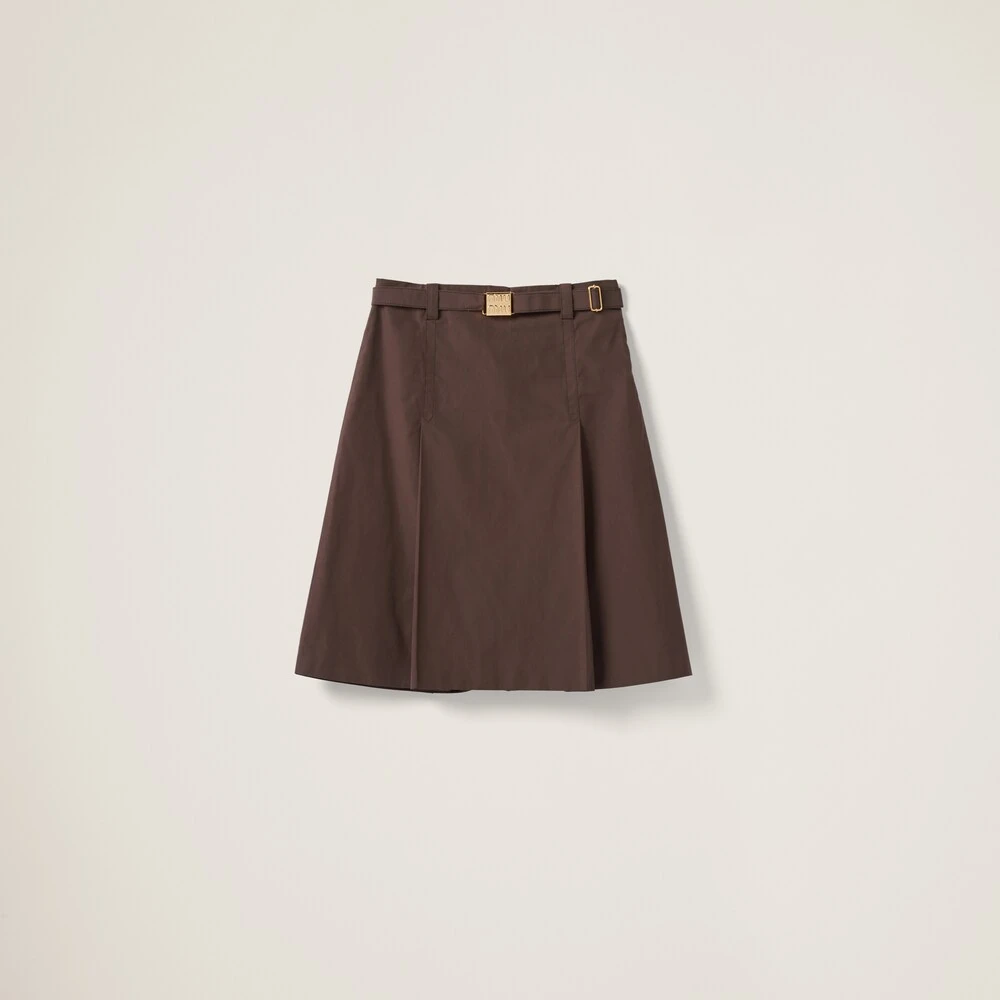 This skirt in Panama cotton expresses Miu Miu’s refined, dynamic, and carefree femininity. Two slits, one on the front and one on the back, lighten the silhouette, adding movement. The belt with logo-decorated buckle, inspired by utility wear, complete the aesthetic with an iconic touch.