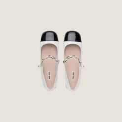 A harmonious contrast of materials enhances these elegant, delicate ballerinas. A sophisticated chain accents the silhouette completed by the iconic Miu Miu pearl on the closure. The chromatic contrast between the toe and upper recalls retro styles given a modern twist.