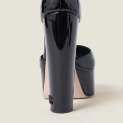 These patent leather platform pumps evoke retro moods while expressing modern style. The ankle strap and chunky heel complete the bold design of the shoe while the lettering logo adds an iconic note to the look.