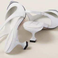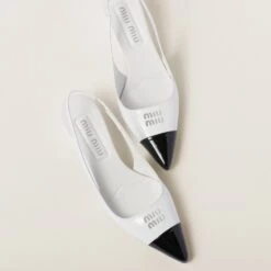 Classic details and an ultra-modern character: The new patent leather pumps express distinctive and refined femininity. The toe introduces a refined color contrast while the perforated logo decorates the bold and iconic Miu Miu design.
