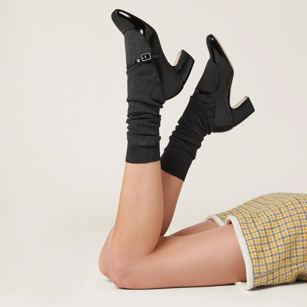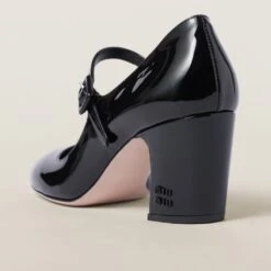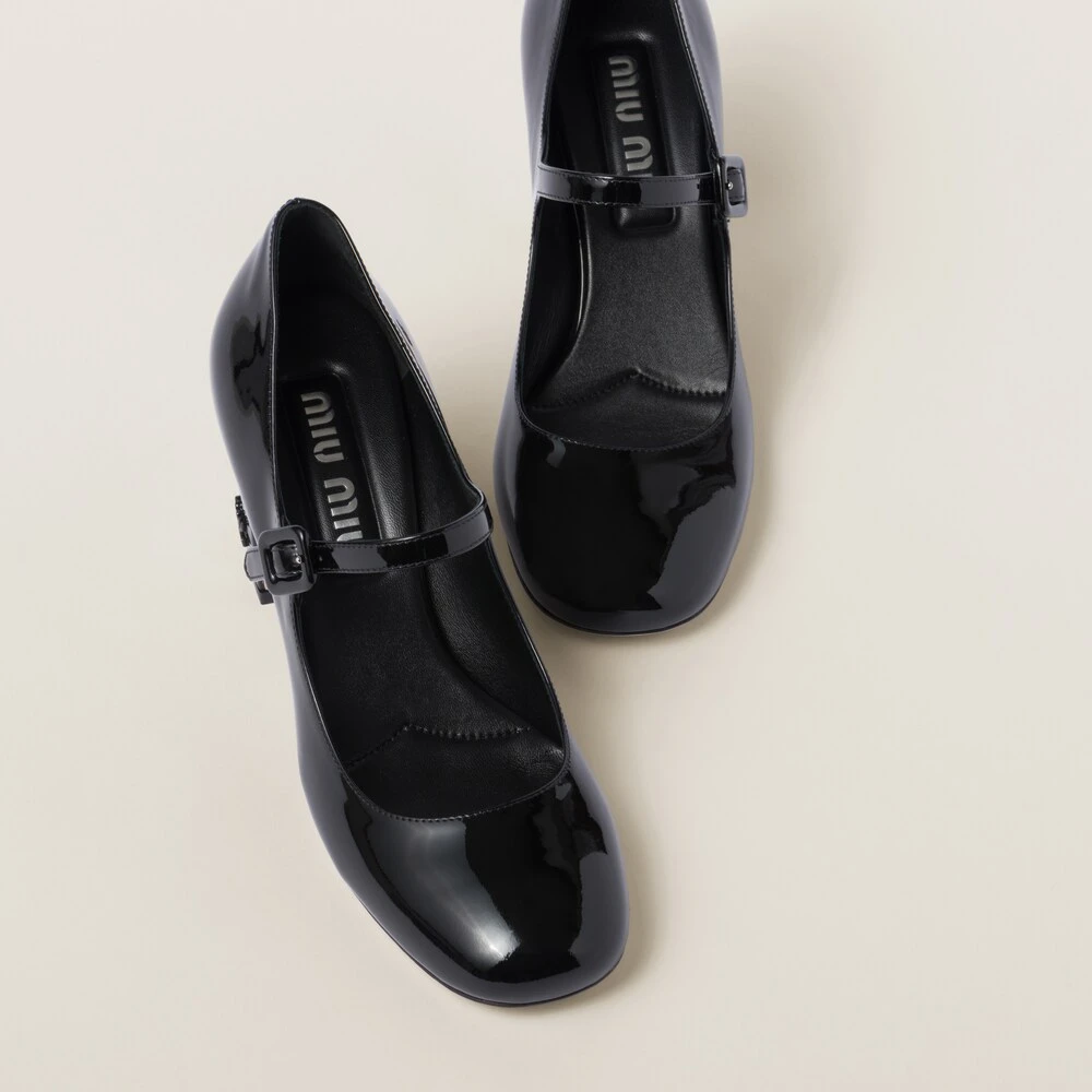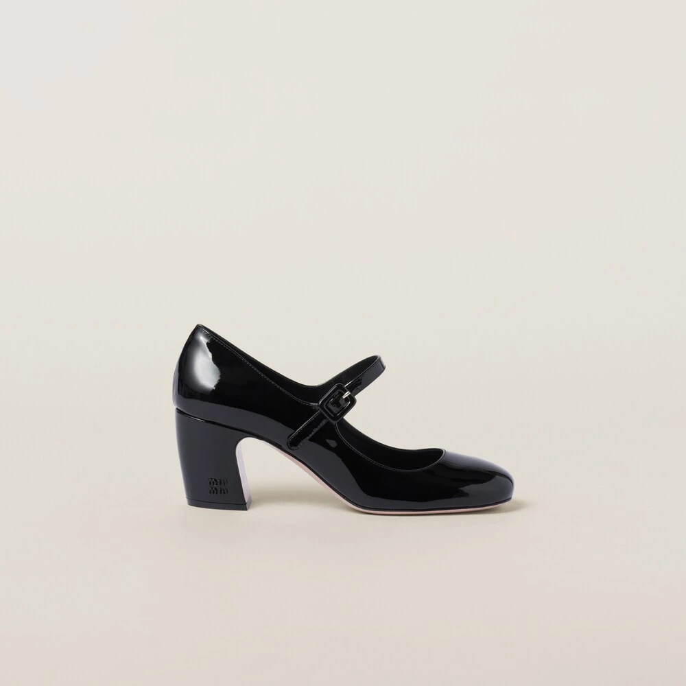 Miu Miu plays with classic style and retro inspiration in these patent leather pumps. The structured heel accentuates the vintage character of the shoe while the logo on the heel completes the look with an unexpected iconic note.