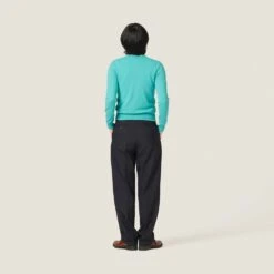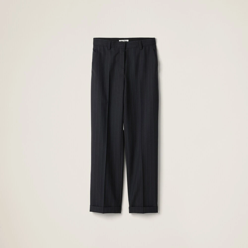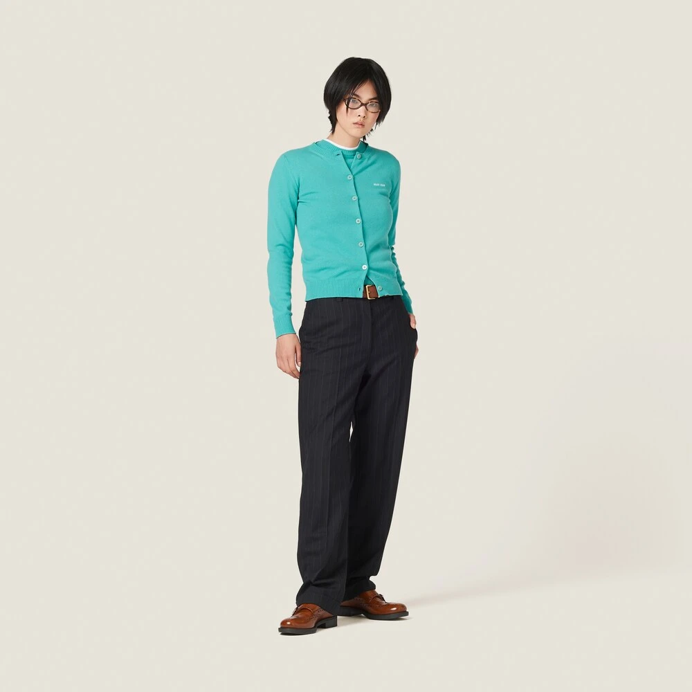 These pants reflect sartorial elegance and are inspired by menswear, integrating refined Miu Miu style. The embroidered logo stands out near one of the back welt pockets, completing the look with a distinctive note.
