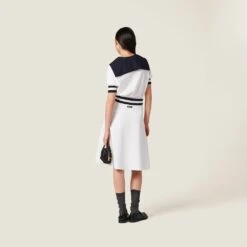 Sporty inspiration embraces casual yet refined Miu Miu mood in this new piqué skirt. The two-tone knit waistband accents the casual look of the garment while the jacquard logo completes the design with an unexpected iconic note.