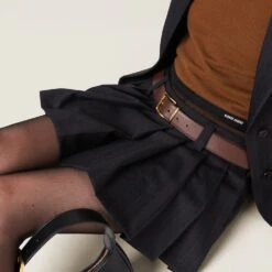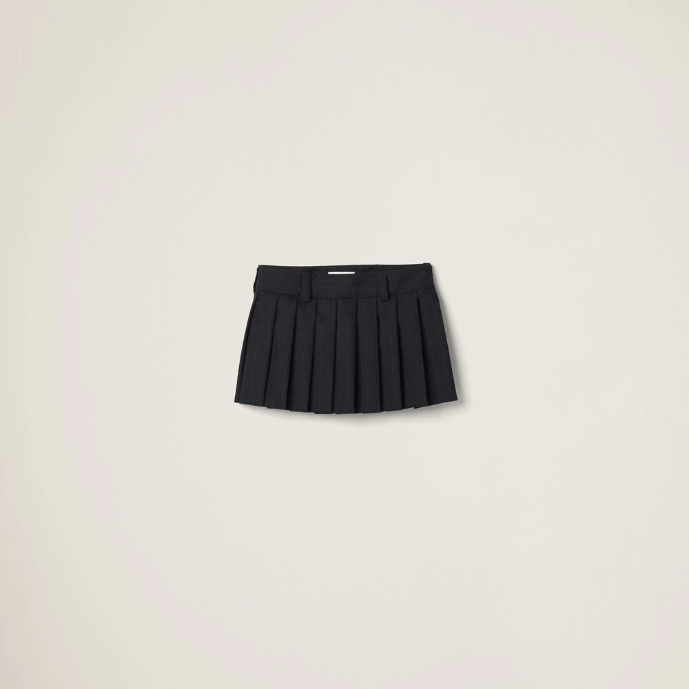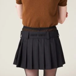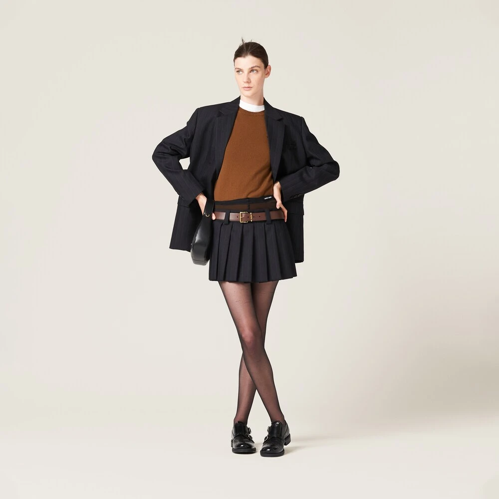 A classic menswear motif is combined with Miu Miu’s charismatic personality in this skirt. Pleating gives movement to the pinstriped garment, while the embroidered logo completes the design with an unexpected iconic note.