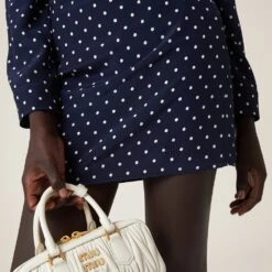 The lively, retro style of the polka-dot print is combined with the crisp texture of crepe de chine in this miniskirt. The logo completes the look with an iconic and distinctive note.